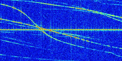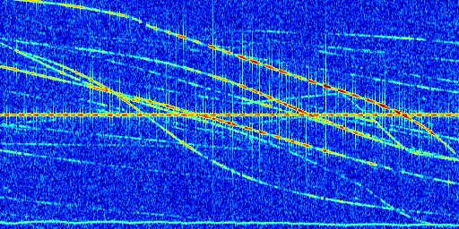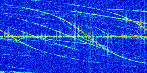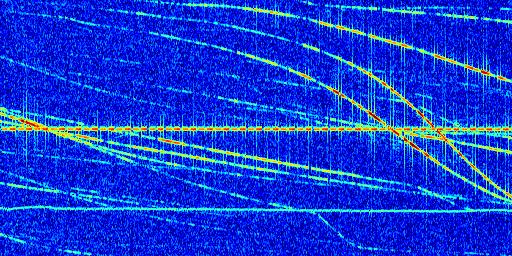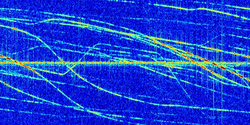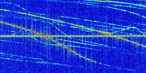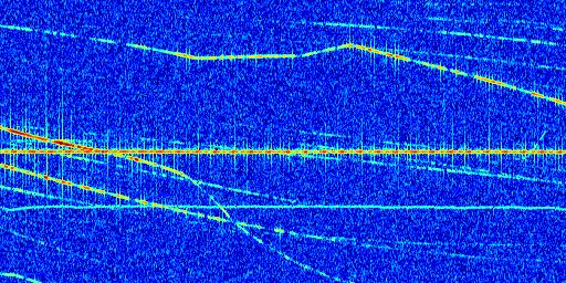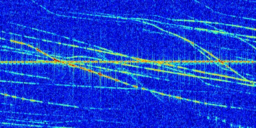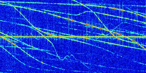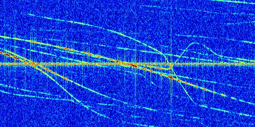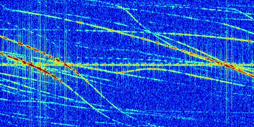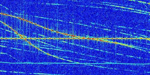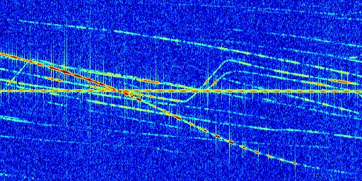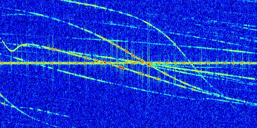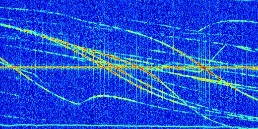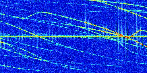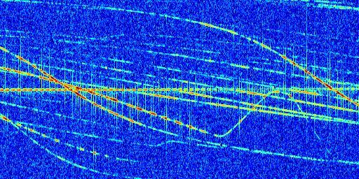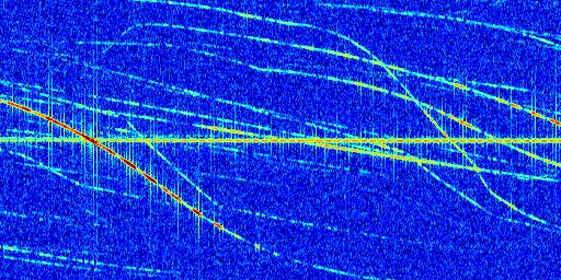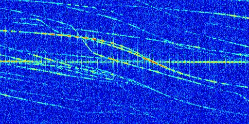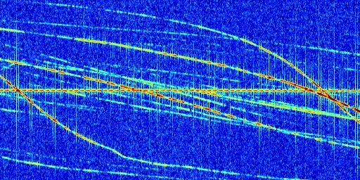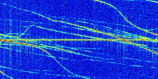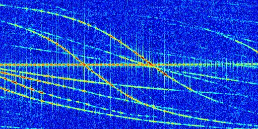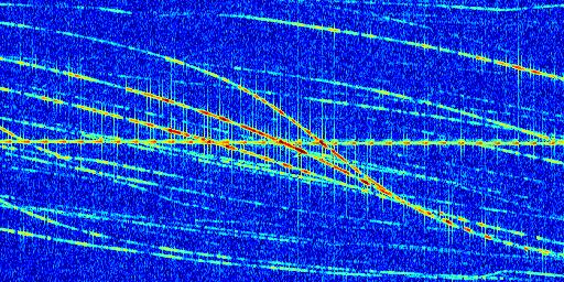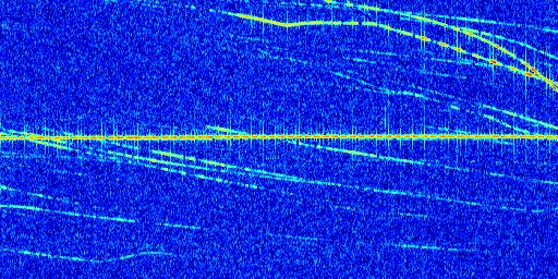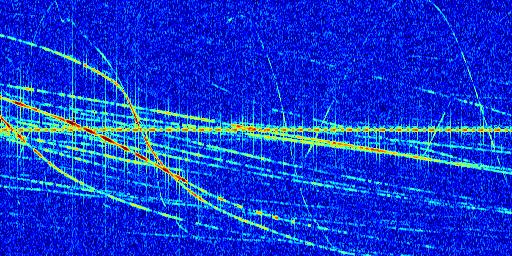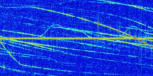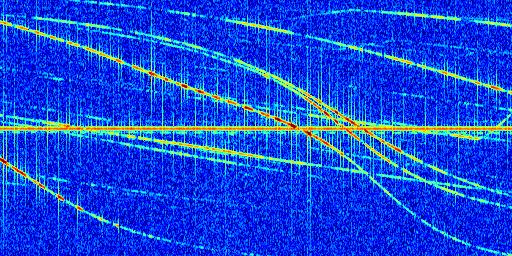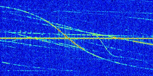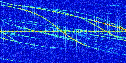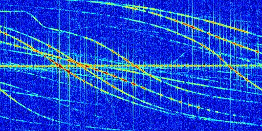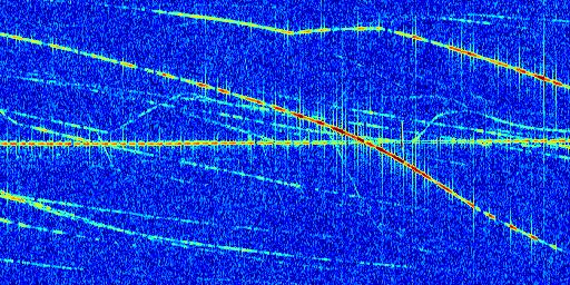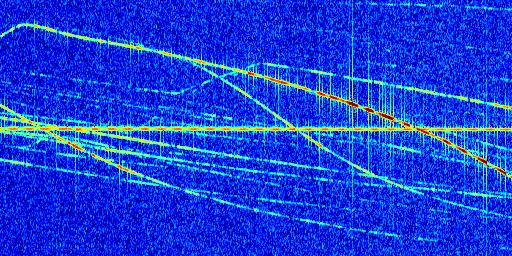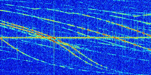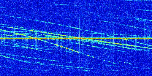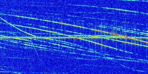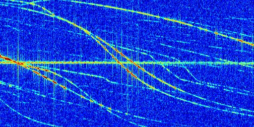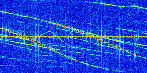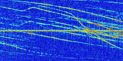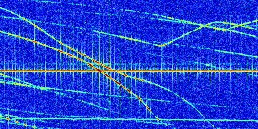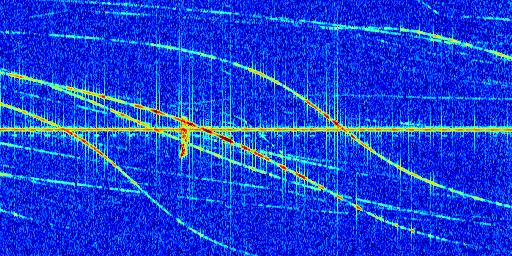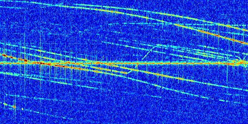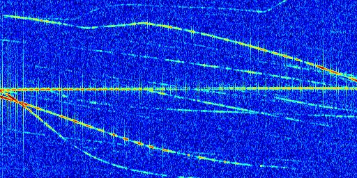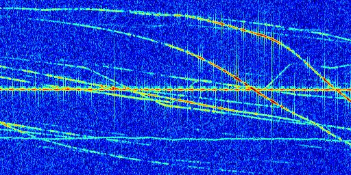 Sur la deuxième ligne, est représenté le spectrogramme radio du radar GRAVES. Un spectrogramme est une représentation d'un signal dans laquelle l'axe des abscisses représente le temps et l'axe des ordonnées les fréquences (hautes fréquences en haut, basses fréquences en bas). Au centre de ce spectrogramme on retrouve une ligne continue horizontale. C'est la trace de l'émetteur radio de GRAVES qui est ne varie pas en fréquence au cours du temps. Autour de cette dernière, on peut observer de nombreuses autres traces dont la fréquence varie. Ces traces résultent de la réflexion du signal radio de GRAVES sur des aéronefs en mouvement, générant un décalage Doppler. En observant finement ces dernières, il est possible de distinguer l'aviation civile et militaire.