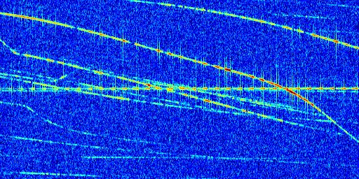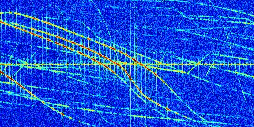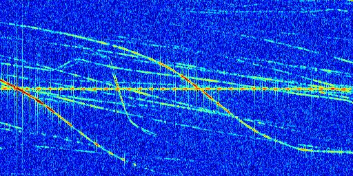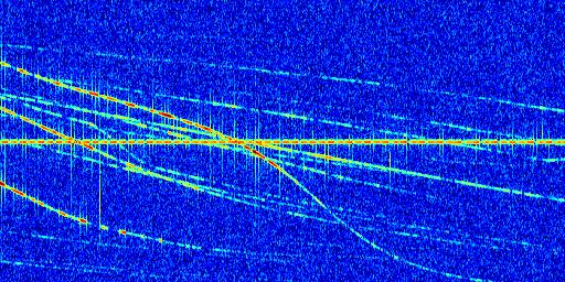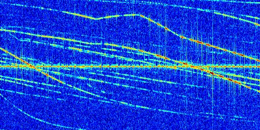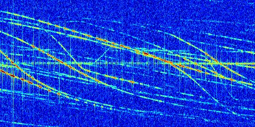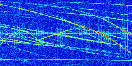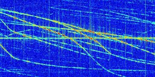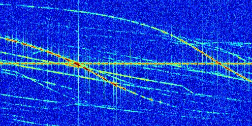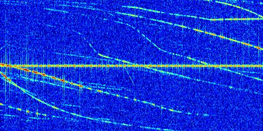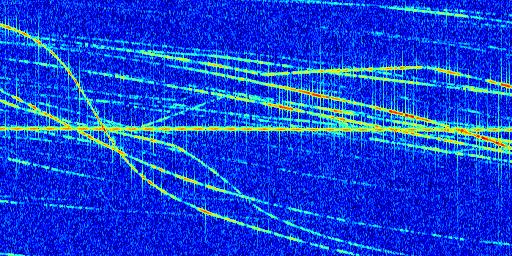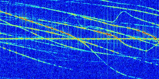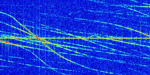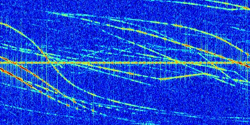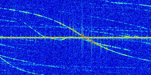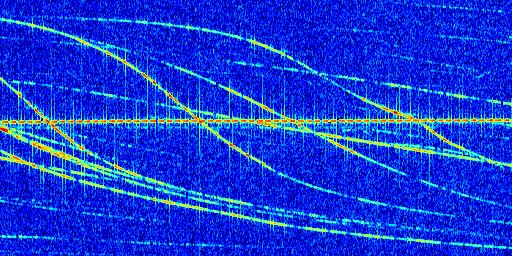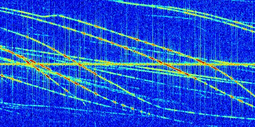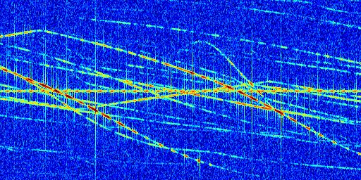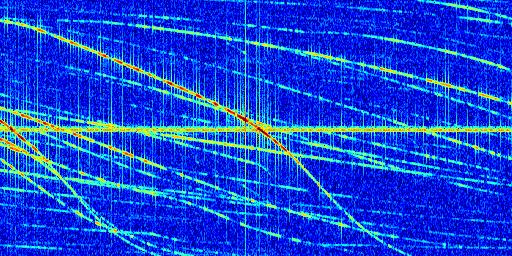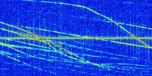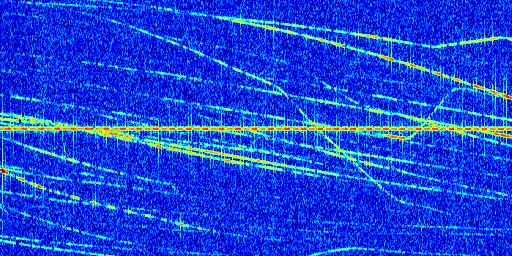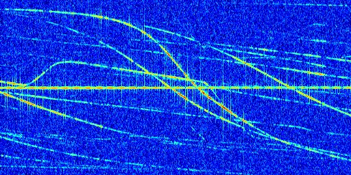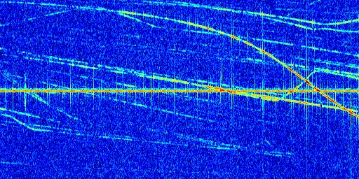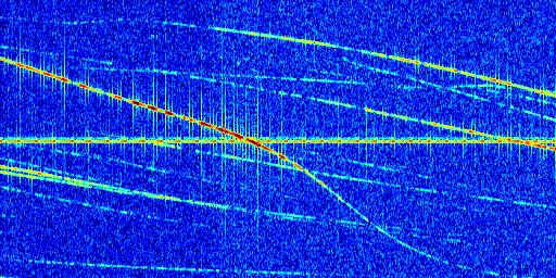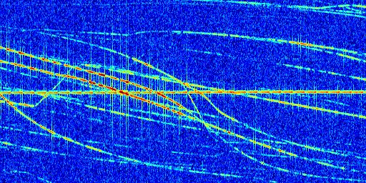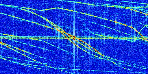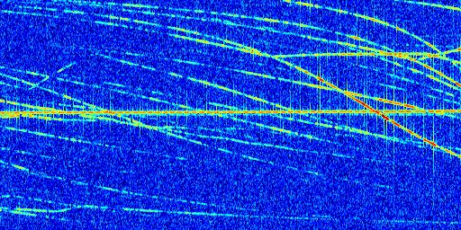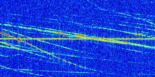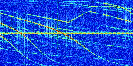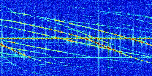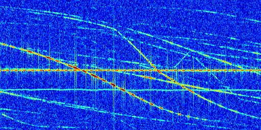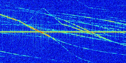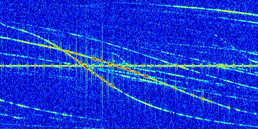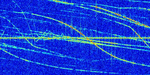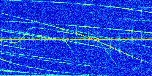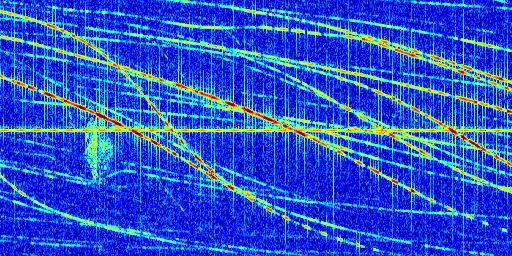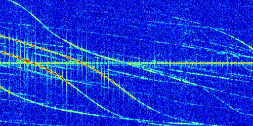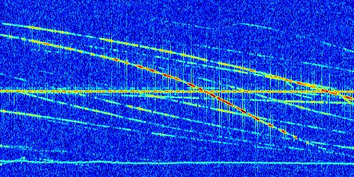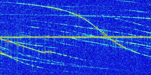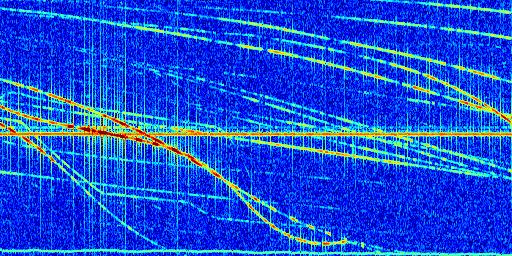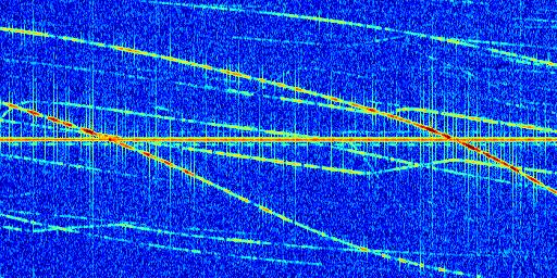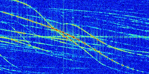 Sur la deuxième ligne, est représenté le spectrogramme radio du radar GRAVES. Un spectrogramme est une représentation d'un signal dans laquelle l'axe des abscisses représente le temps et l'axe des ordonnées les fréquences (hautes fréquences en haut, basses fréquences en bas). Au centre de ce spectrogramme on retrouve une ligne continue horizontale. C'est la trace de l'émetteur radio de GRAVES qui est ne varie pas en fréquence au cours du temps. Autour de cette dernière, on peut observer de nombreuses autres traces dont la fréquence varie. Ces traces résultent de la réflexion du signal radio de GRAVES sur des aéronefs en mouvement, générant un décalage Doppler. En observant finement ces dernières, il est possible de distinguer l'aviation civile et militaire.