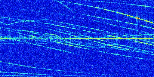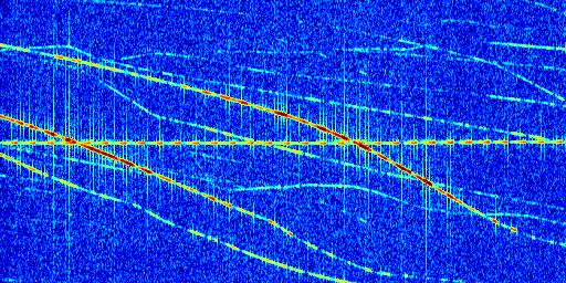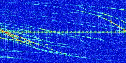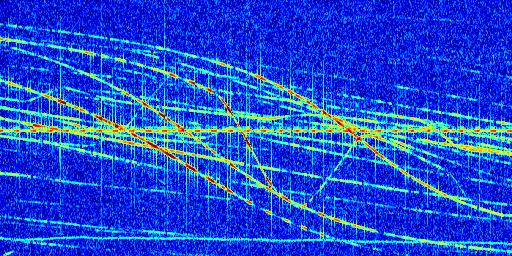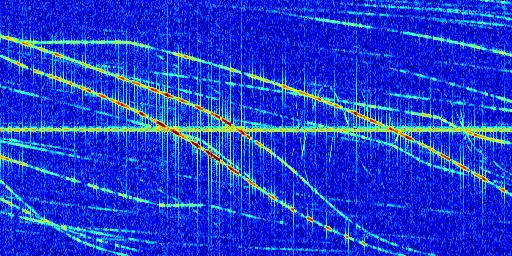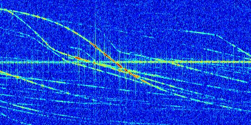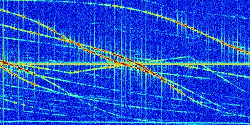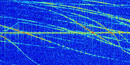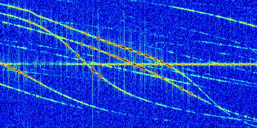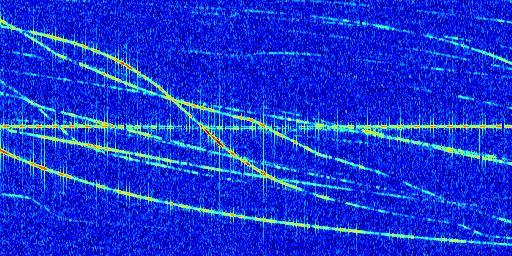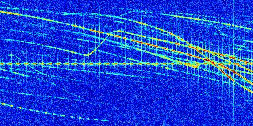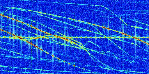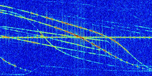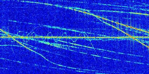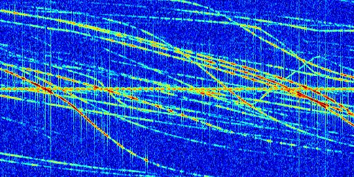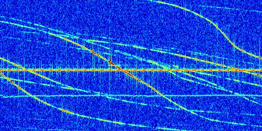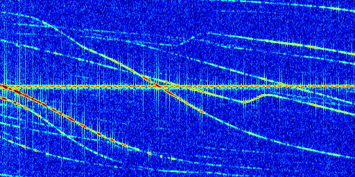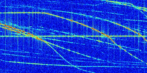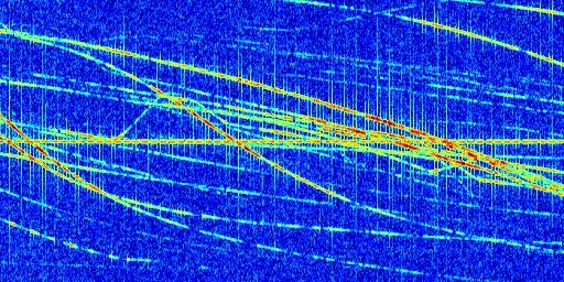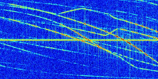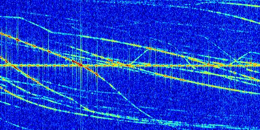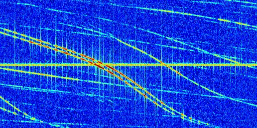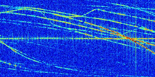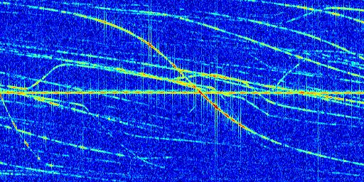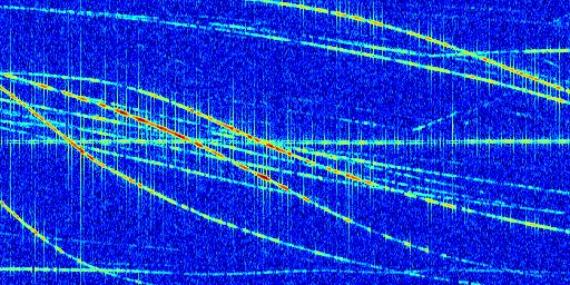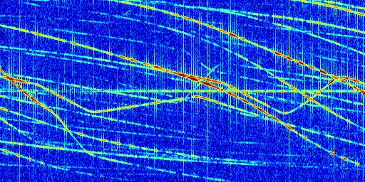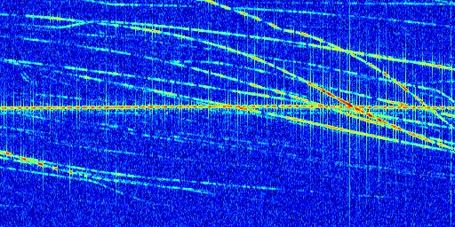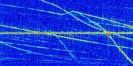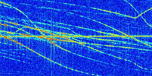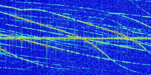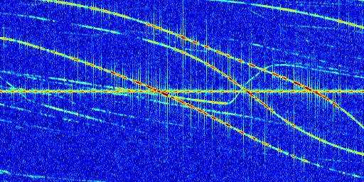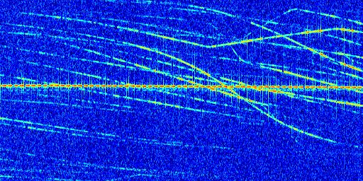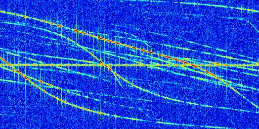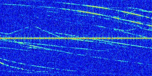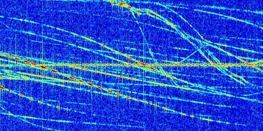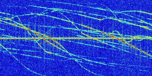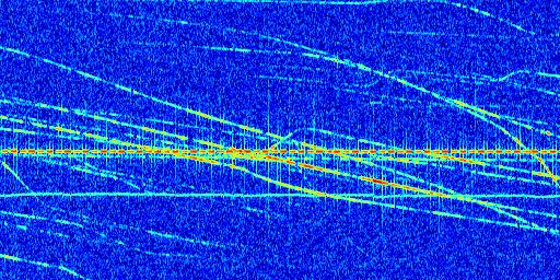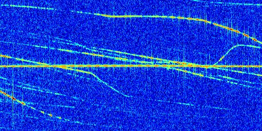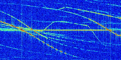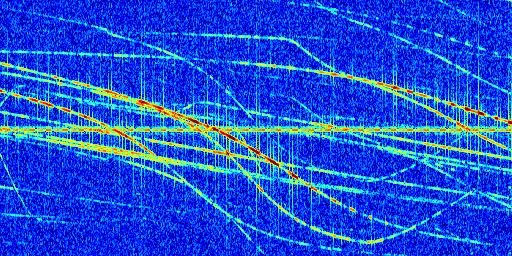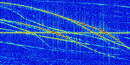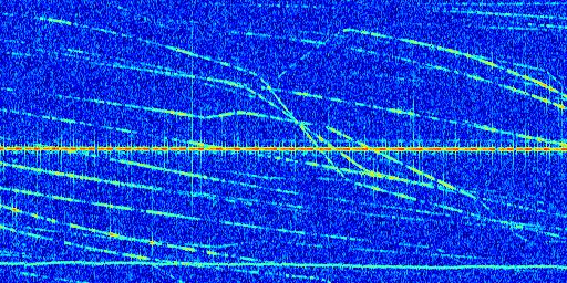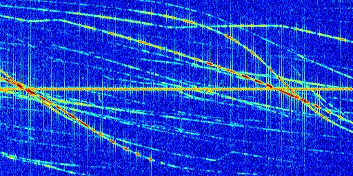 Sur la deuxième ligne, est représenté le spectrogramme radio du radar GRAVES. Un spectrogramme est une représentation d'un signal dans laquelle l'axe des abscisses représente le temps et l'axe des ordonnées les fréquences (hautes fréquences en haut, basses fréquences en bas). Au centre de ce spectrogramme on retrouve une ligne continue horizontale. C'est la trace de l'émetteur radio de GRAVES qui est ne varie pas en fréquence au cours du temps. Autour de cette dernière, on peut observer de nombreuses autres traces dont la fréquence varie. Ces traces résultent de la réflexion du signal radio de GRAVES sur des aéronefs en mouvement, générant un décalage Doppler. En observant finement ces dernières, il est possible de distinguer l'aviation civile et militaire.