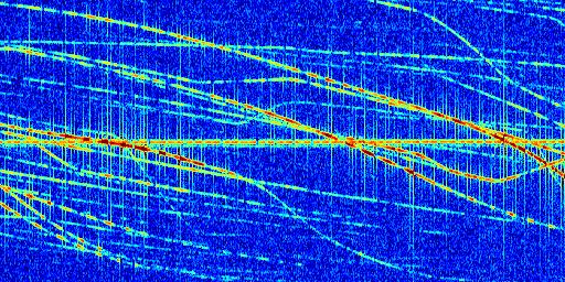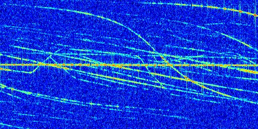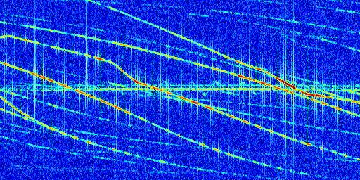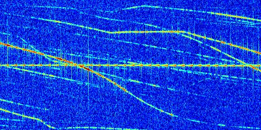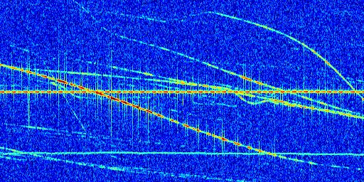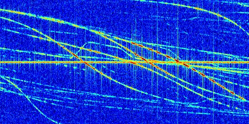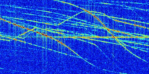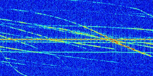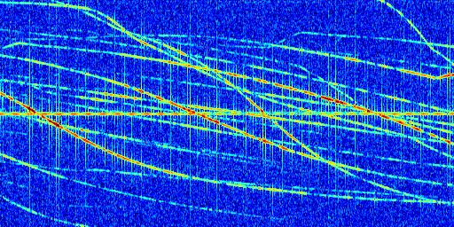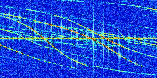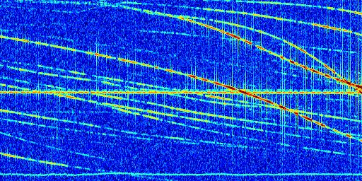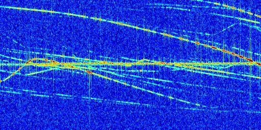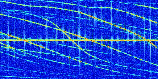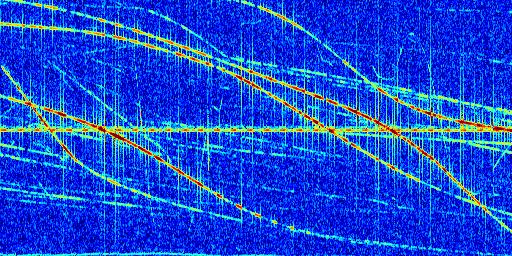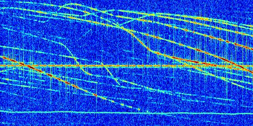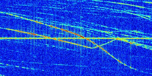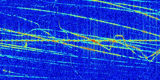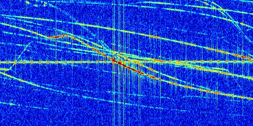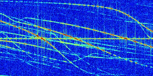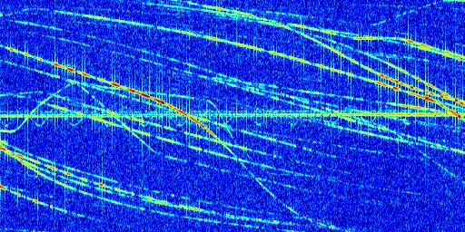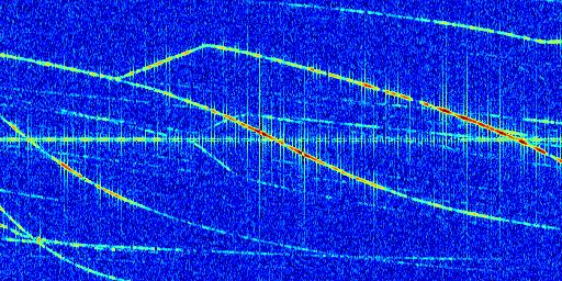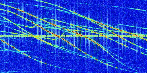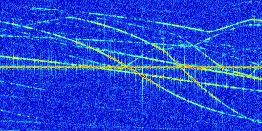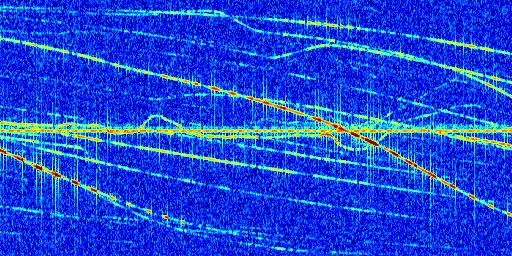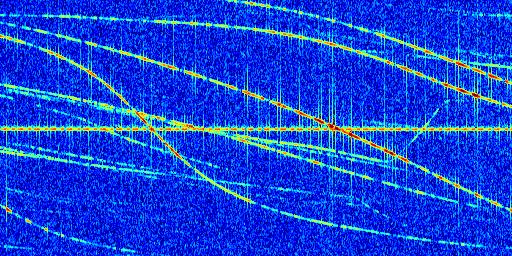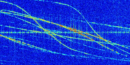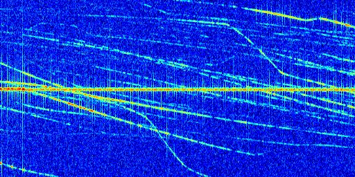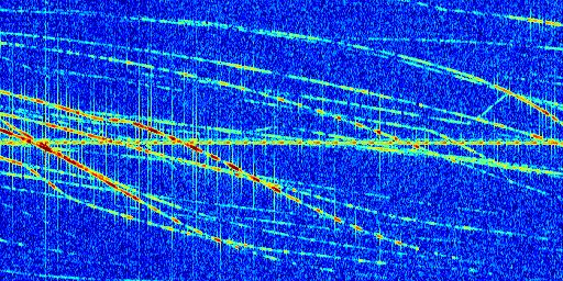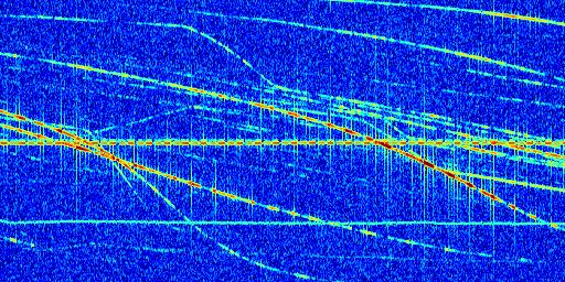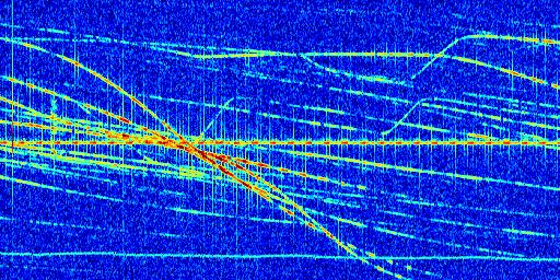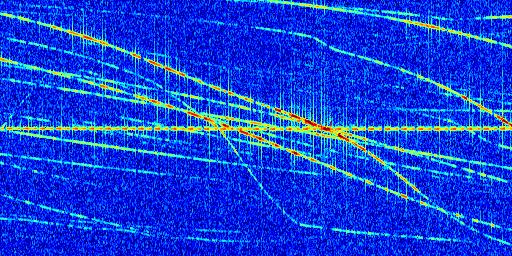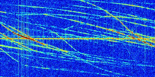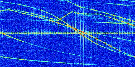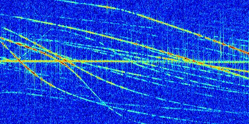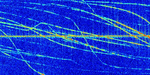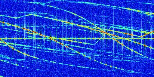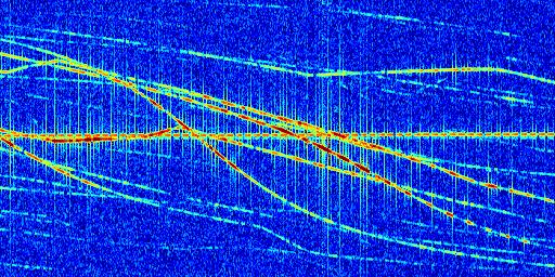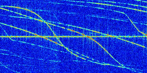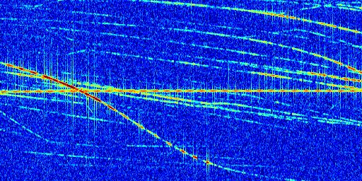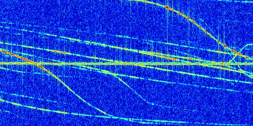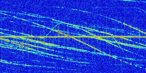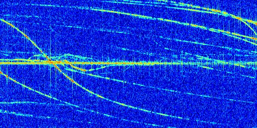 Sur la deuxième ligne, est représenté le spectrogramme radio du radar GRAVES. Un spectrogramme est une représentation d'un signal dans laquelle l'axe des abscisses représente le temps et l'axe des ordonnées les fréquences (hautes fréquences en haut, basses fréquences en bas). Au centre de ce spectrogramme on retrouve une ligne continue horizontale. C'est la trace de l'émetteur radio de GRAVES qui est ne varie pas en fréquence au cours du temps. Autour de cette dernière, on peut observer de nombreuses autres traces dont la fréquence varie. Ces traces résultent de la réflexion du signal radio de GRAVES sur des aéronefs en mouvement, générant un décalage Doppler. En observant finement ces dernières, il est possible de distinguer l'aviation civile et militaire.
