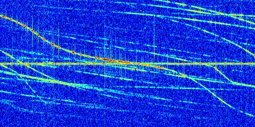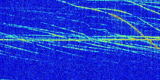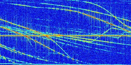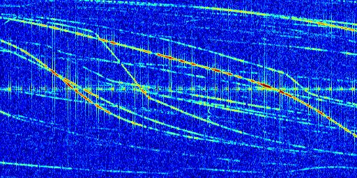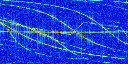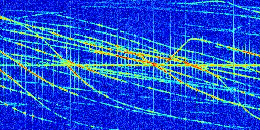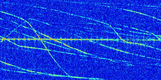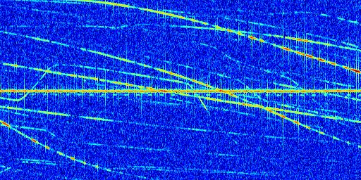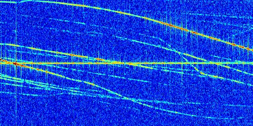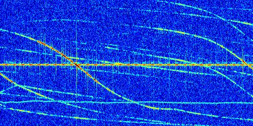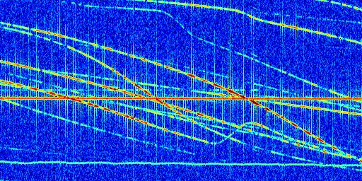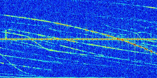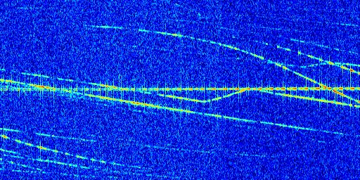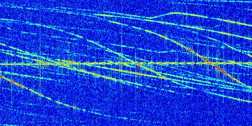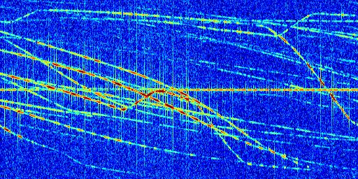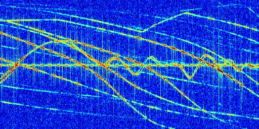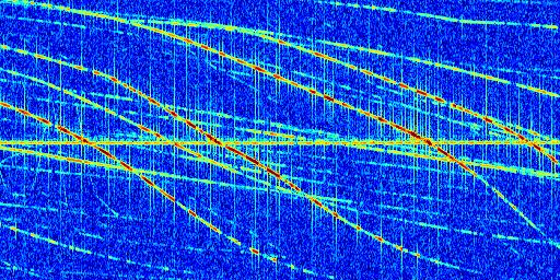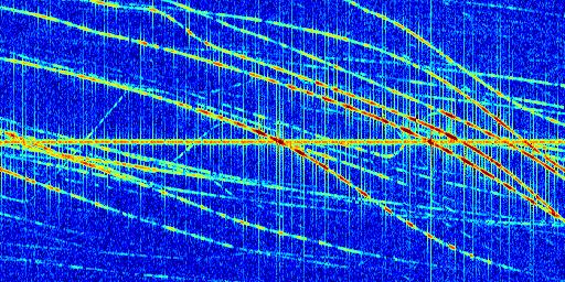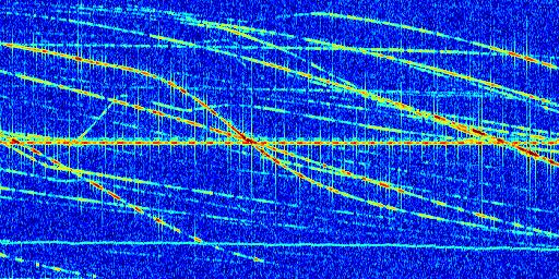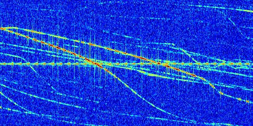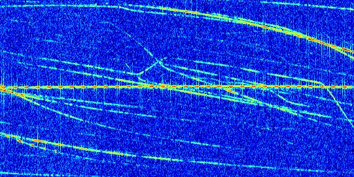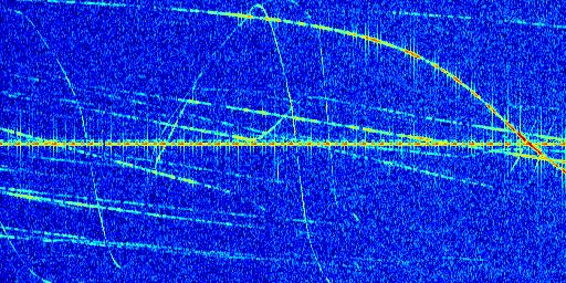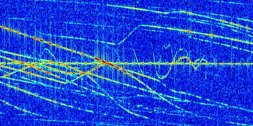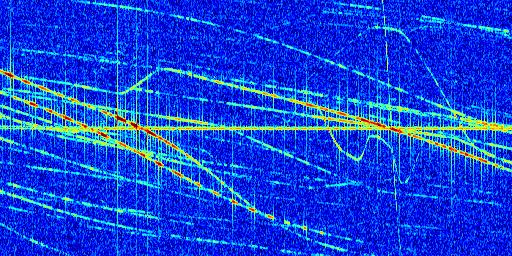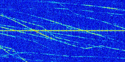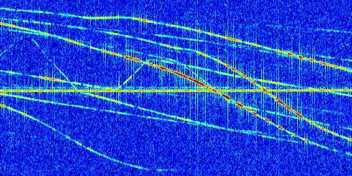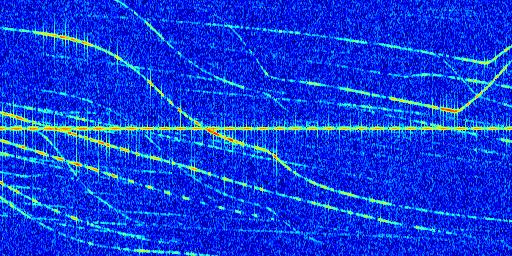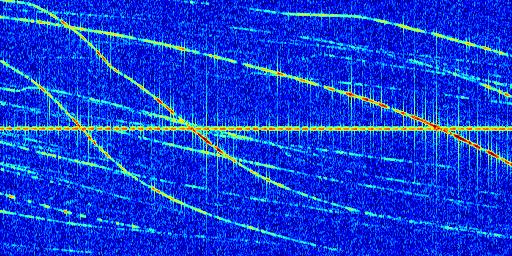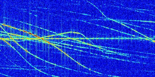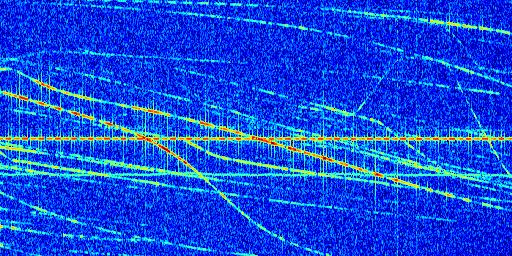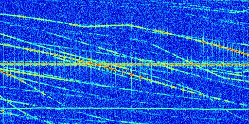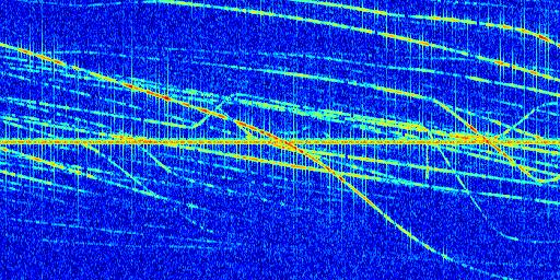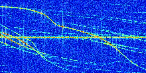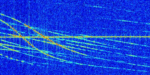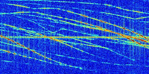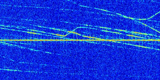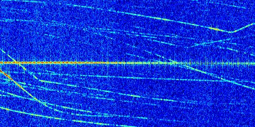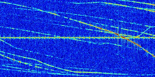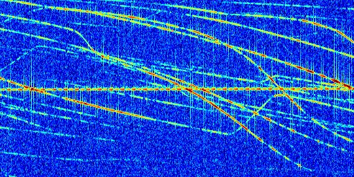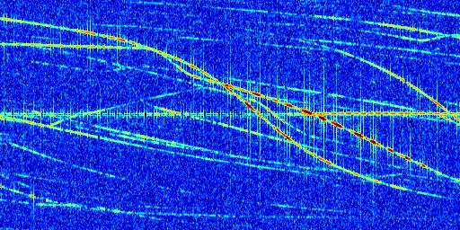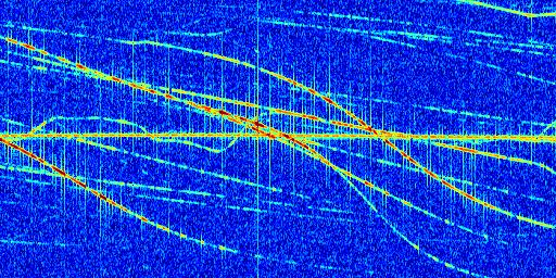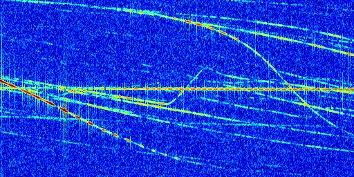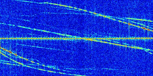 Sur la deuxième ligne, est représenté le spectrogramme radio du radar GRAVES. Un spectrogramme est une représentation d'un signal dans laquelle l'axe des abscisses représente le temps et l'axe des ordonnées les fréquences (hautes fréquences en haut, basses fréquences en bas). Au centre de ce spectrogramme on retrouve une ligne continue horizontale. C'est la trace de l'émetteur radio de GRAVES qui est ne varie pas en fréquence au cours du temps. Autour de cette dernière, on peut observer de nombreuses autres traces dont la fréquence varie. Ces traces résultent de la réflexion du signal radio de GRAVES sur des aéronefs en mouvement, générant un décalage Doppler. En observant finement ces dernières, il est possible de distinguer l'aviation civile et militaire.