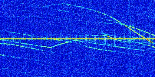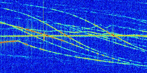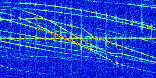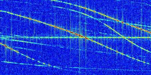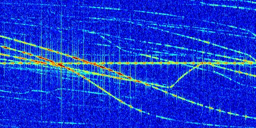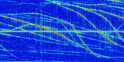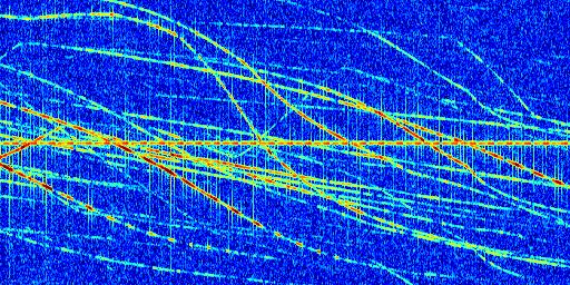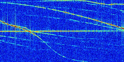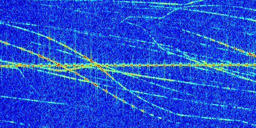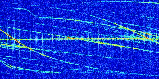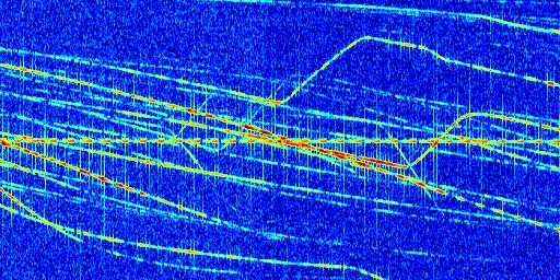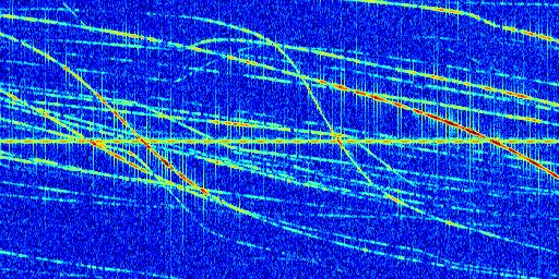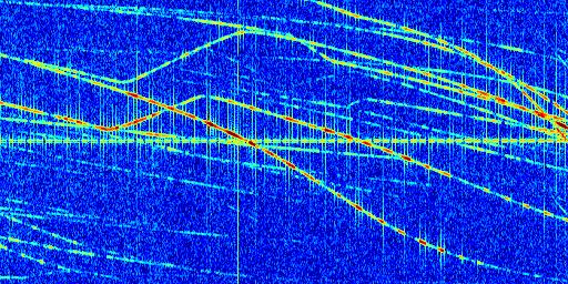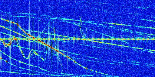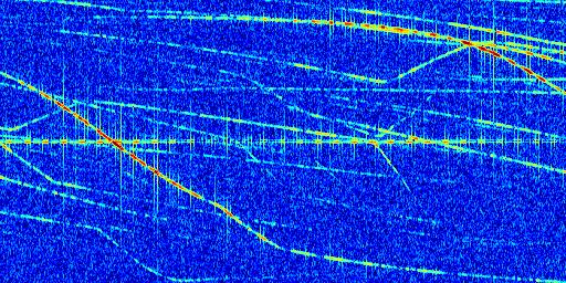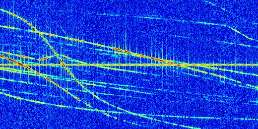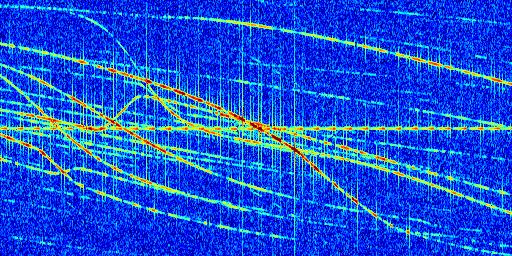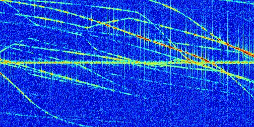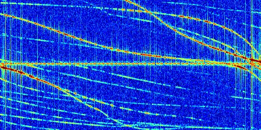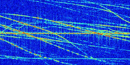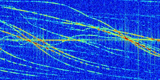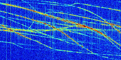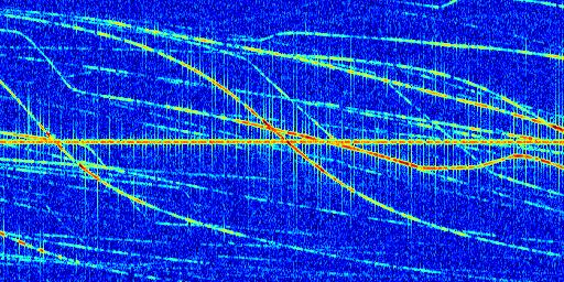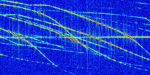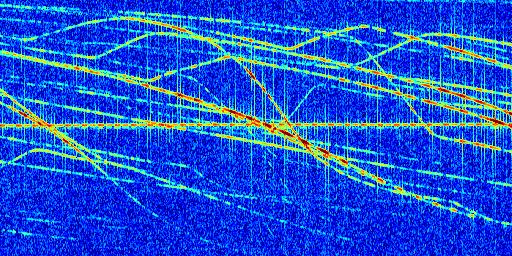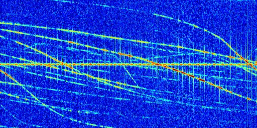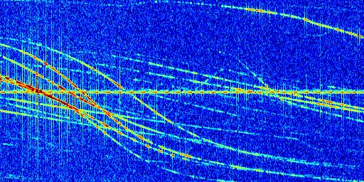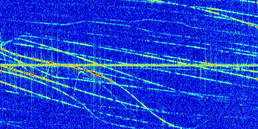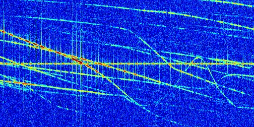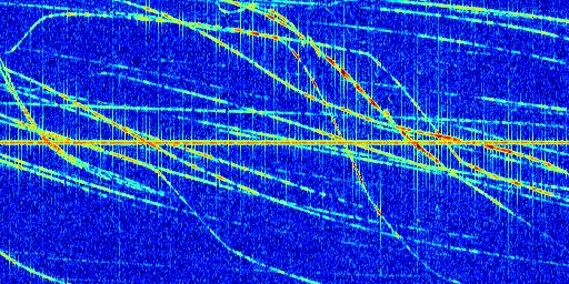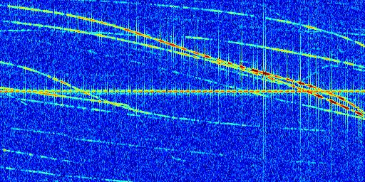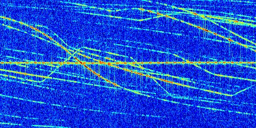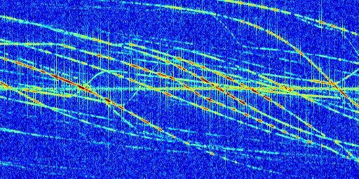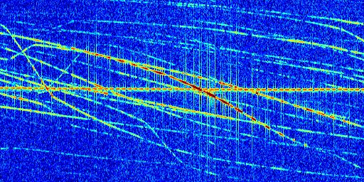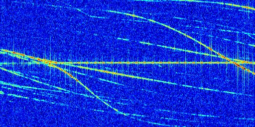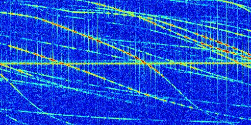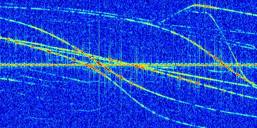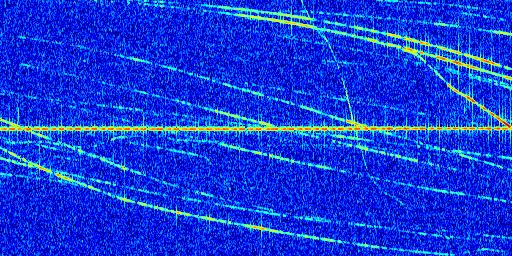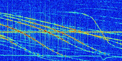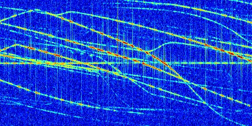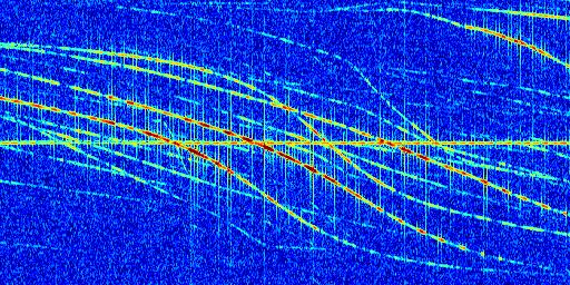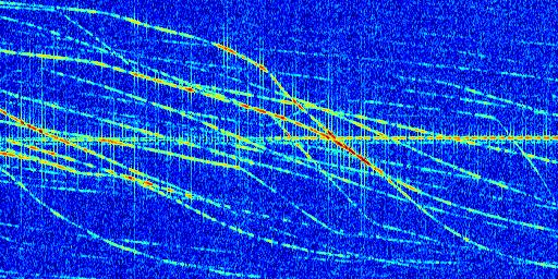 Sur la deuxième ligne, est représenté le spectrogramme radio du radar GRAVES. Un spectrogramme est une représentation d'un signal dans laquelle l'axe des abscisses représente le temps et l'axe des ordonnées les fréquences (hautes fréquences en haut, basses fréquences en bas). Au centre de ce spectrogramme on retrouve une ligne continue horizontale. C'est la trace de l'émetteur radio de GRAVES qui est ne varie pas en fréquence au cours du temps. Autour de cette dernière, on peut observer de nombreuses autres traces dont la fréquence varie. Ces traces résultent de la réflexion du signal radio de GRAVES sur des aéronefs en mouvement, générant un décalage Doppler. En observant finement ces dernières, il est possible de distinguer l'aviation civile et militaire.
