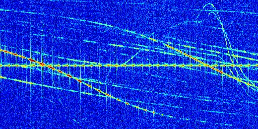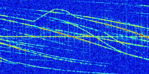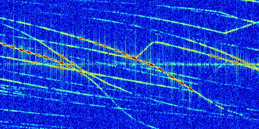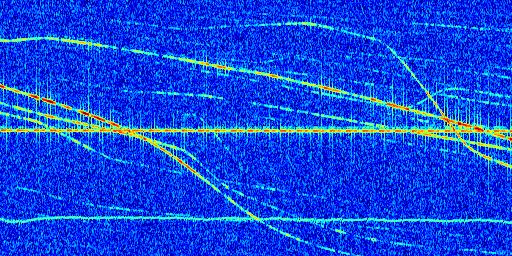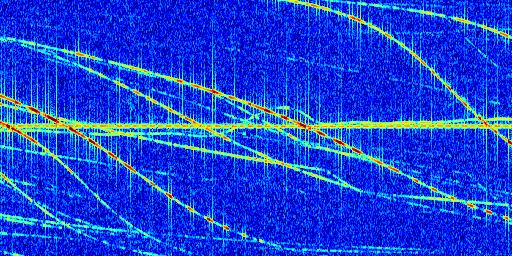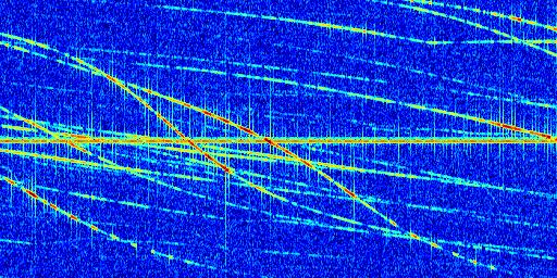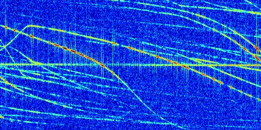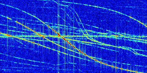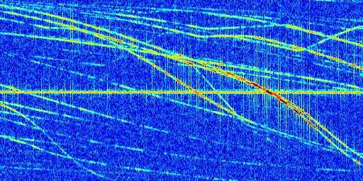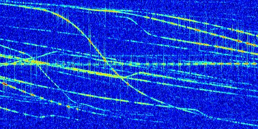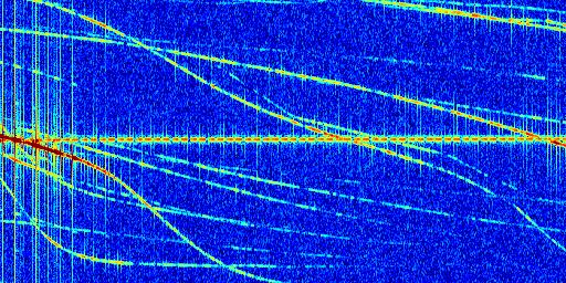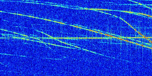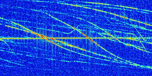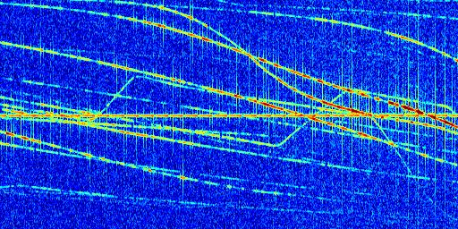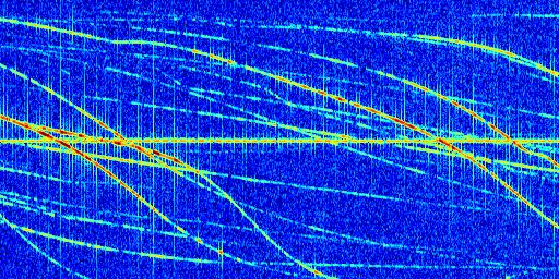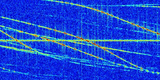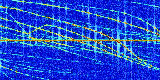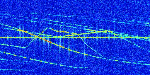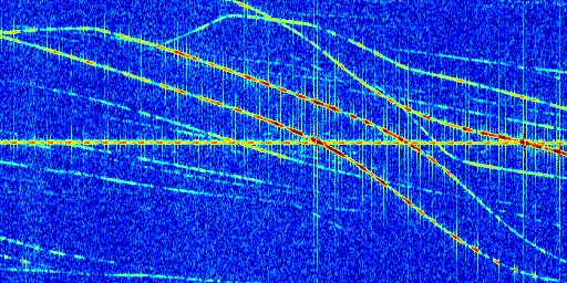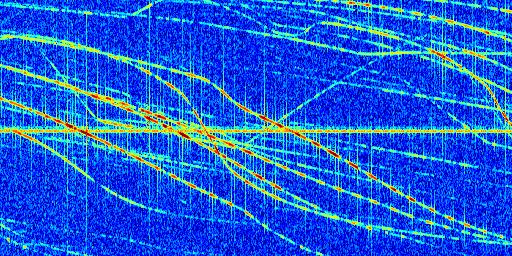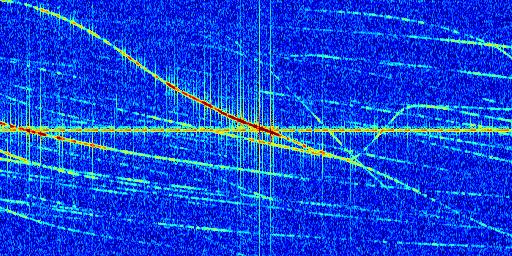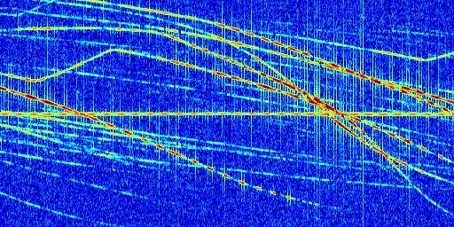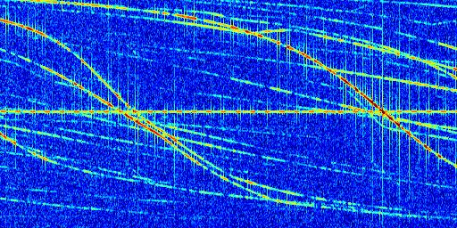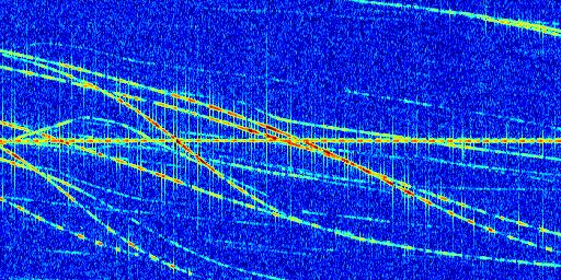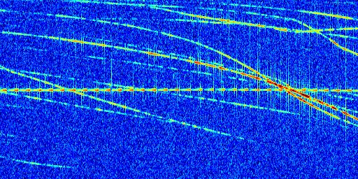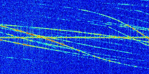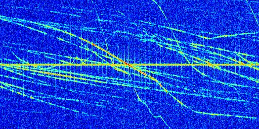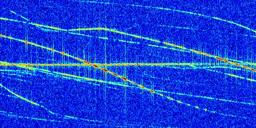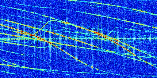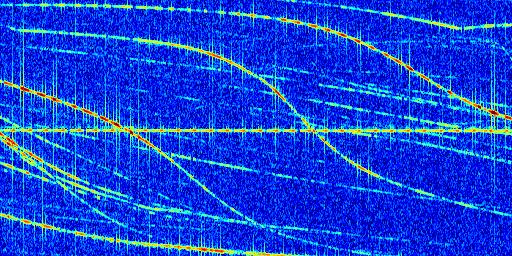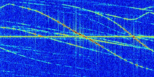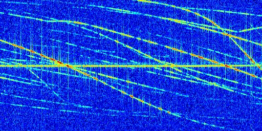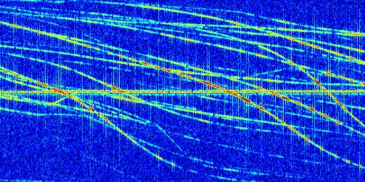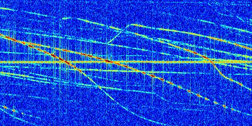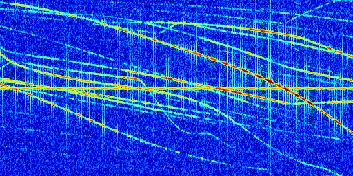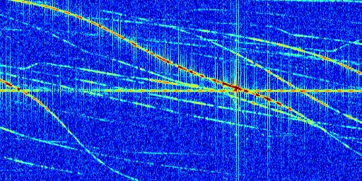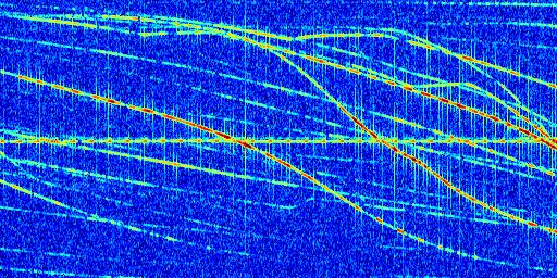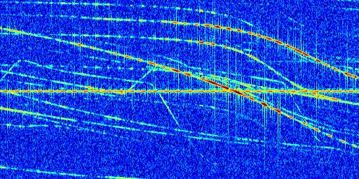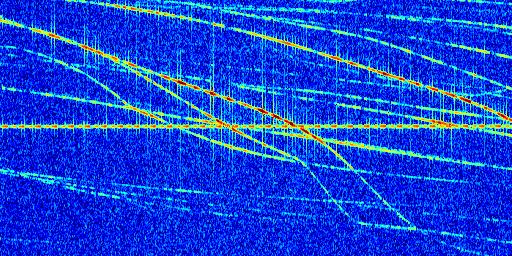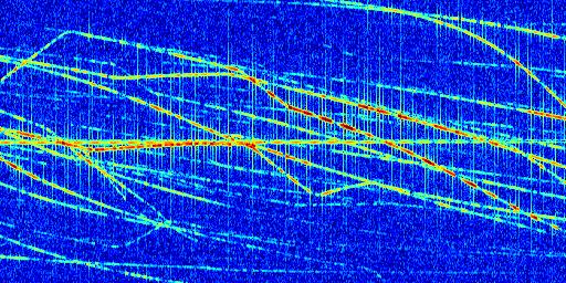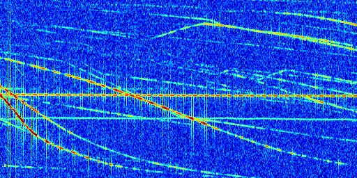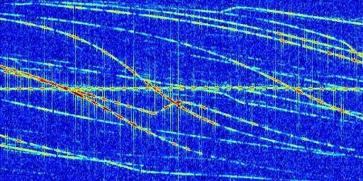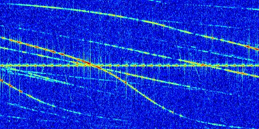 Sur la deuxième ligne, est représenté le spectrogramme radio du radar GRAVES. Un spectrogramme est une représentation d'un signal dans laquelle l'axe des abscisses représente le temps et l'axe des ordonnées les fréquences (hautes fréquences en haut, basses fréquences en bas). Au centre de ce spectrogramme on retrouve une ligne continue horizontale. C'est la trace de l'émetteur radio de GRAVES qui est ne varie pas en fréquence au cours du temps. Autour de cette dernière, on peut observer de nombreuses autres traces dont la fréquence varie. Ces traces résultent de la réflexion du signal radio de GRAVES sur des aéronefs en mouvement, générant un décalage Doppler. En observant finement ces dernières, il est possible de distinguer l'aviation civile et militaire.