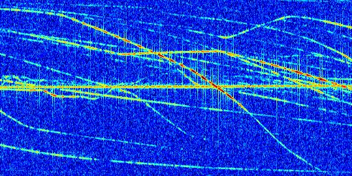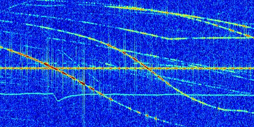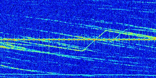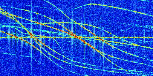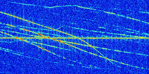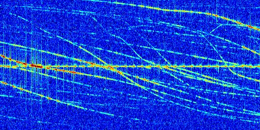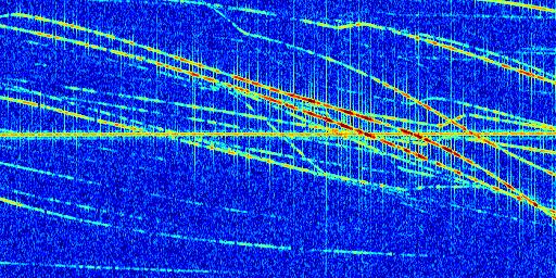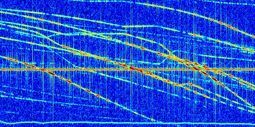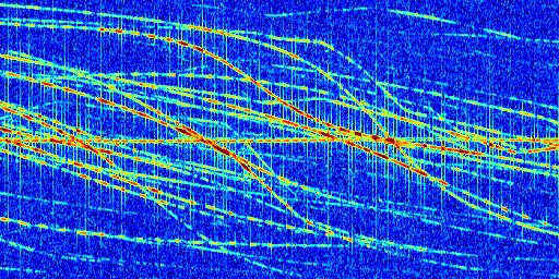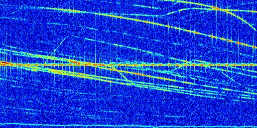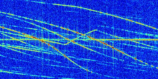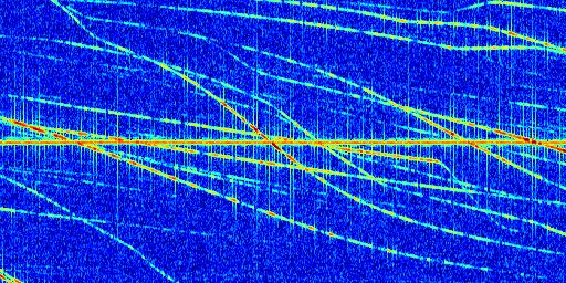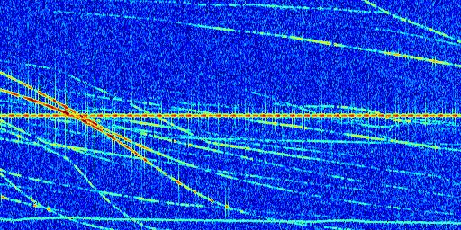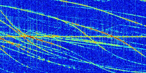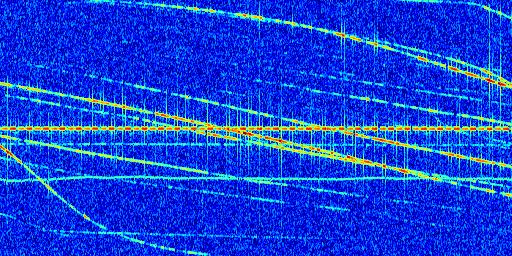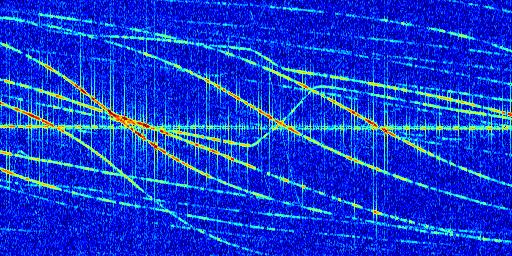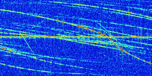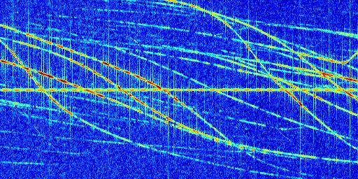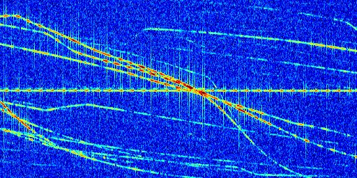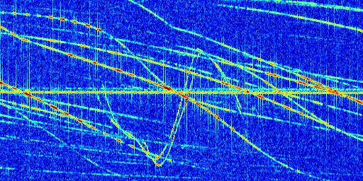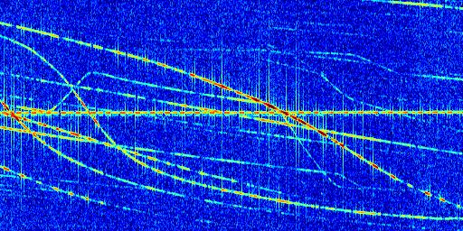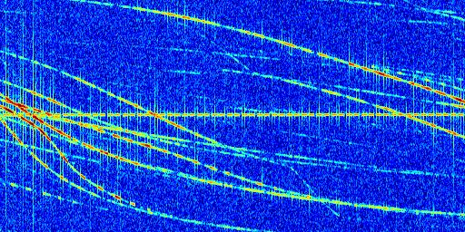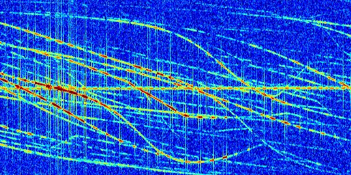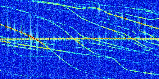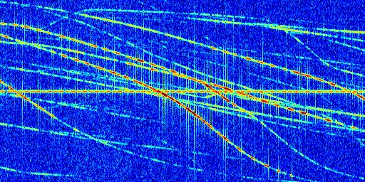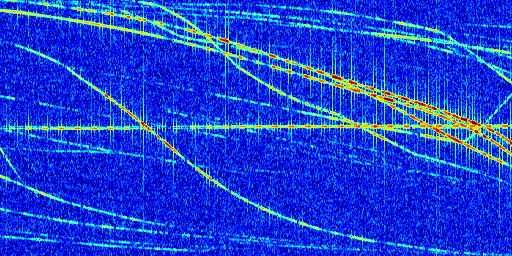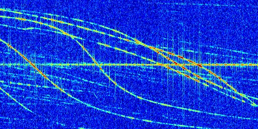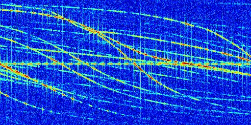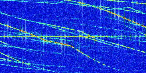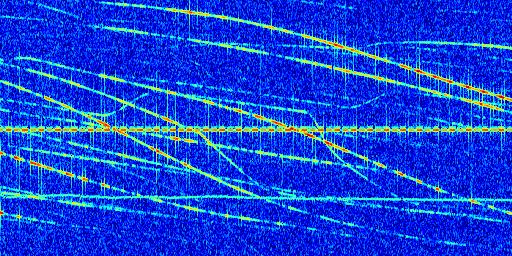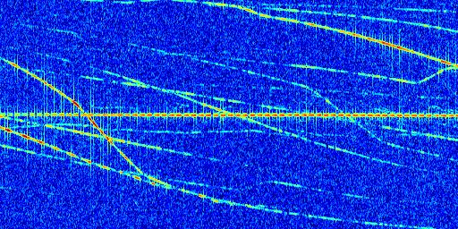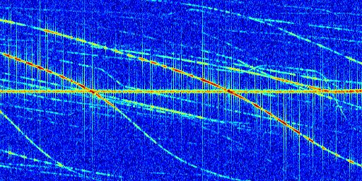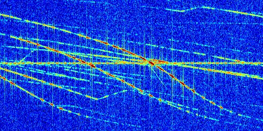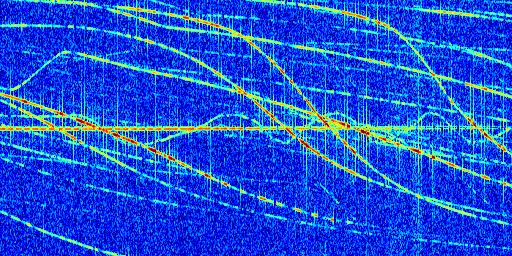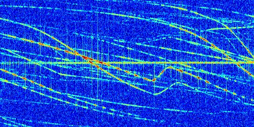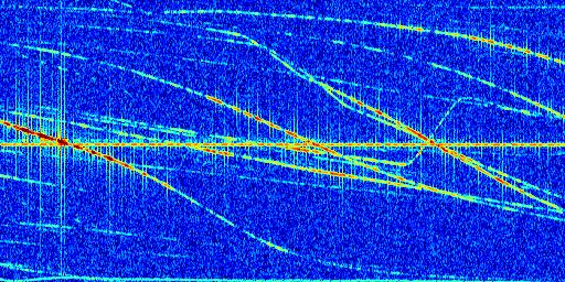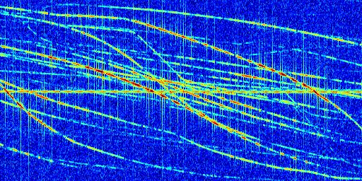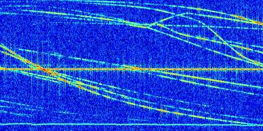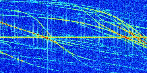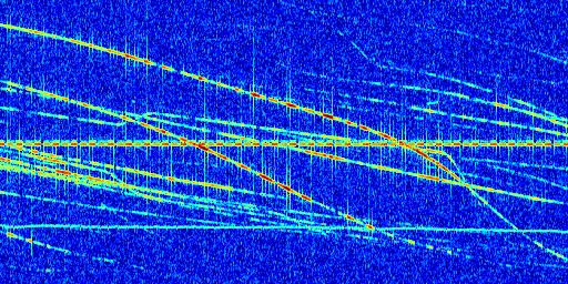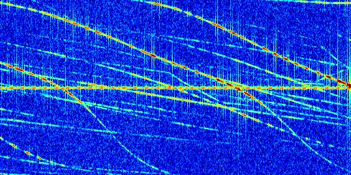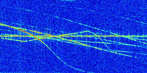 Sur la deuxième ligne, est représenté le spectrogramme radio du radar GRAVES. Un spectrogramme est une représentation d'un signal dans laquelle l'axe des abscisses représente le temps et l'axe des ordonnées les fréquences (hautes fréquences en haut, basses fréquences en bas). Au centre de ce spectrogramme on retrouve une ligne continue horizontale. C'est la trace de l'émetteur radio de GRAVES qui est ne varie pas en fréquence au cours du temps. Autour de cette dernière, on peut observer de nombreuses autres traces dont la fréquence varie. Ces traces résultent de la réflexion du signal radio de GRAVES sur des aéronefs en mouvement, générant un décalage Doppler. En observant finement ces dernières, il est possible de distinguer l'aviation civile et militaire.