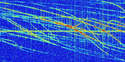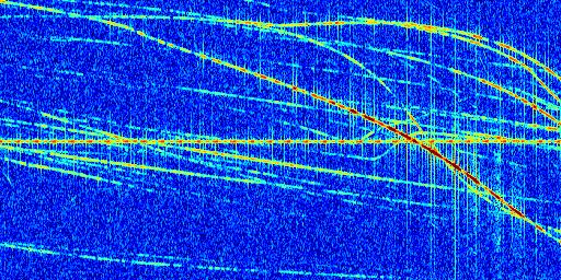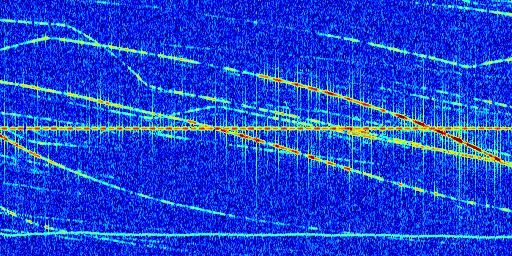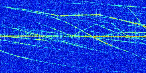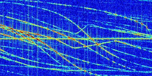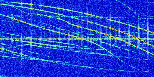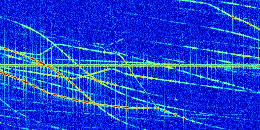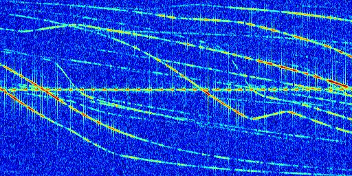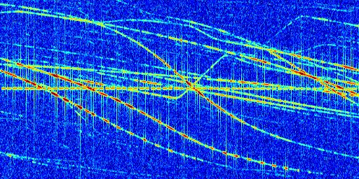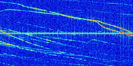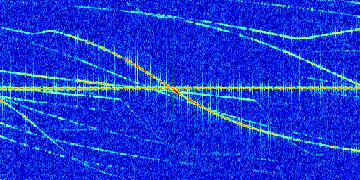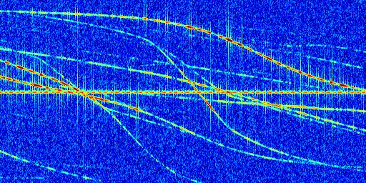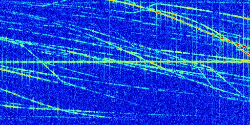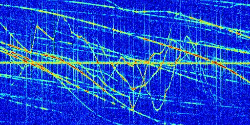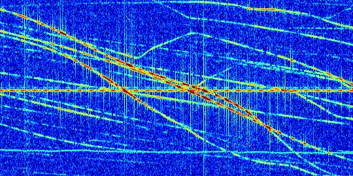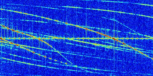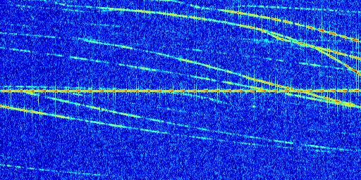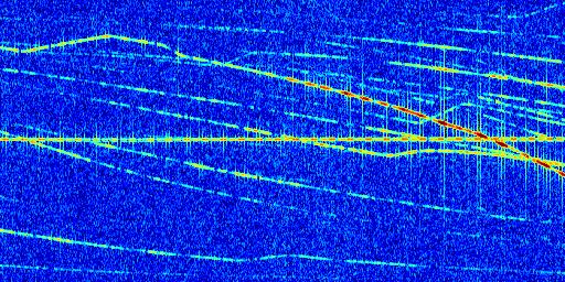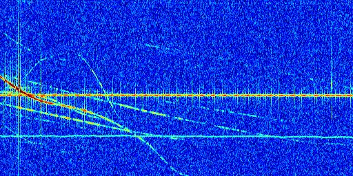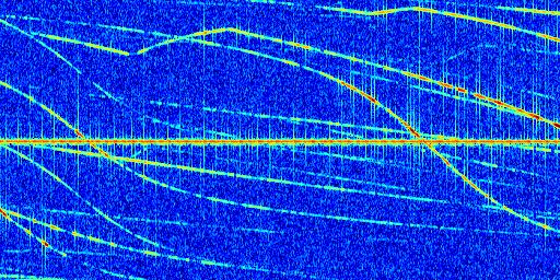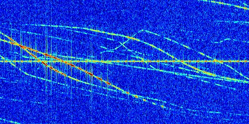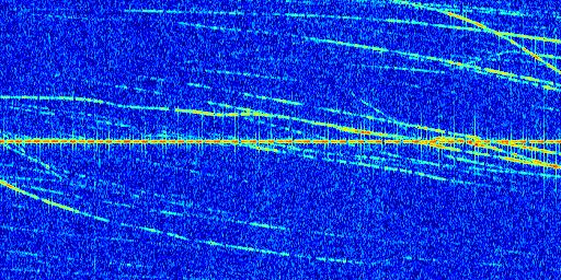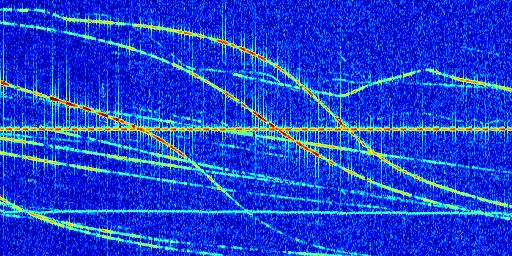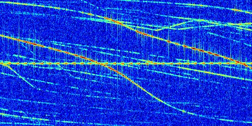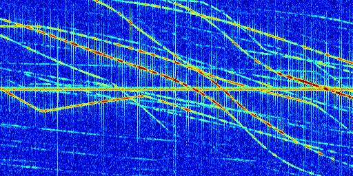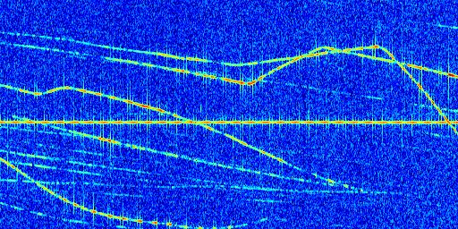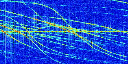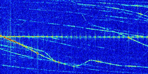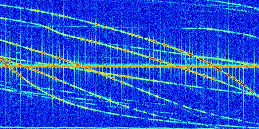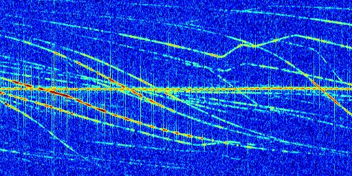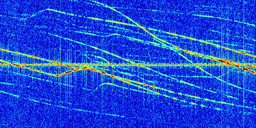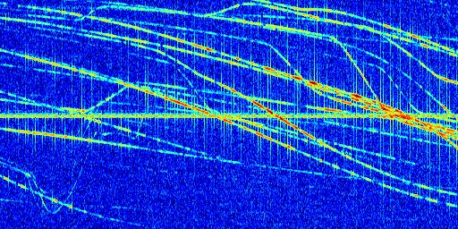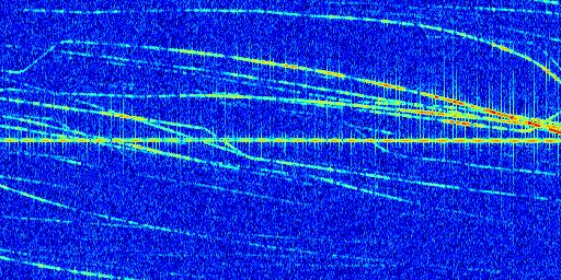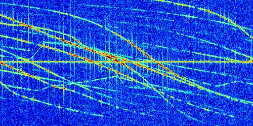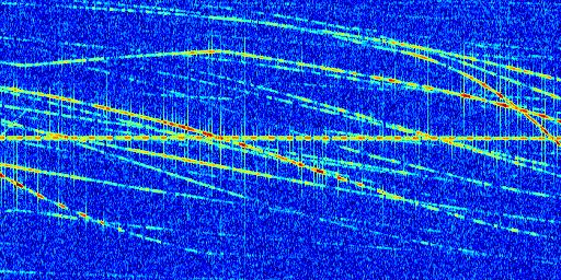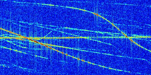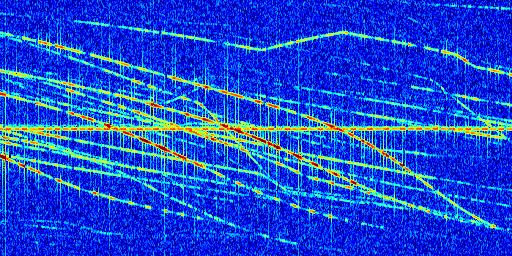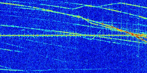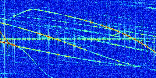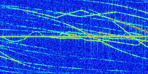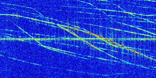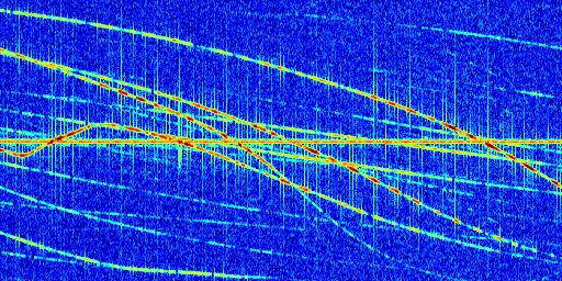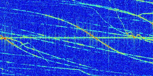 Sur la deuxième ligne, est représenté le spectrogramme radio du radar GRAVES. Un spectrogramme est une représentation d'un signal dans laquelle l'axe des abscisses représente le temps et l'axe des ordonnées les fréquences (hautes fréquences en haut, basses fréquences en bas). Au centre de ce spectrogramme on retrouve une ligne continue horizontale. C'est la trace de l'émetteur radio de GRAVES qui est ne varie pas en fréquence au cours du temps. Autour de cette dernière, on peut observer de nombreuses autres traces dont la fréquence varie. Ces traces résultent de la réflexion du signal radio de GRAVES sur des aéronefs en mouvement, générant un décalage Doppler. En observant finement ces dernières, il est possible de distinguer l'aviation civile et militaire.