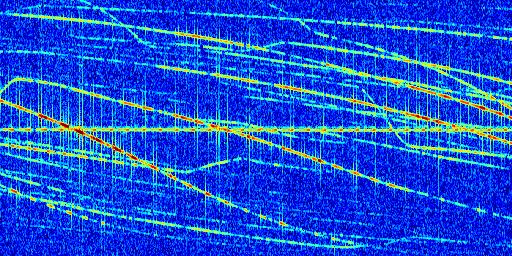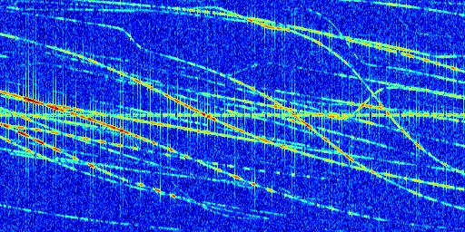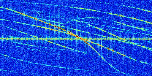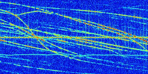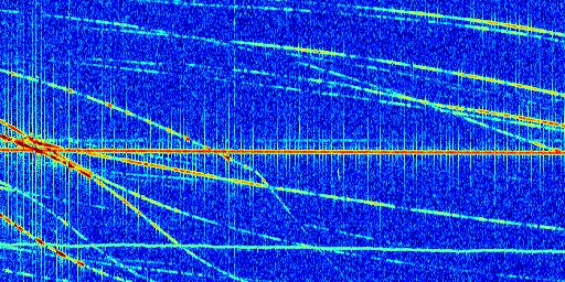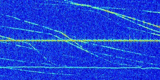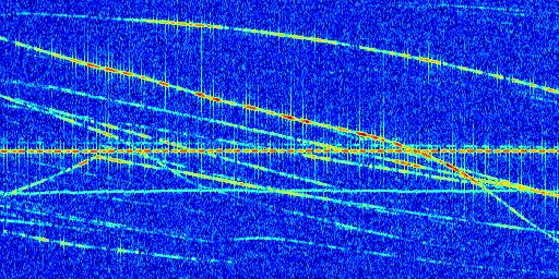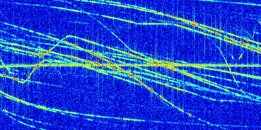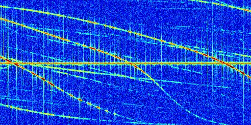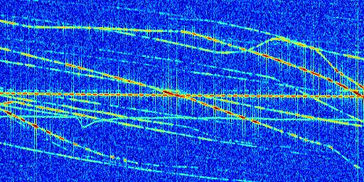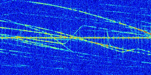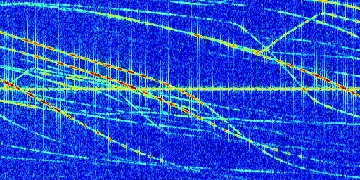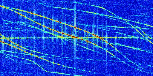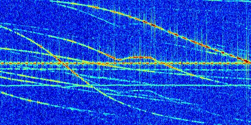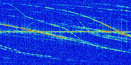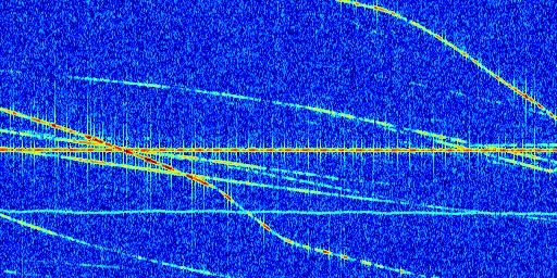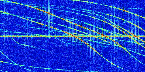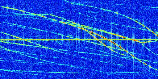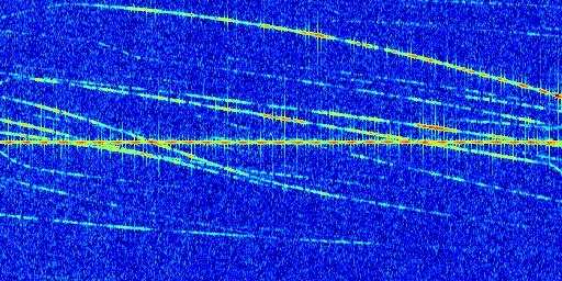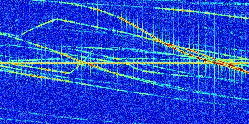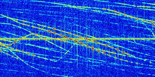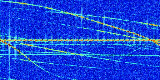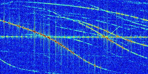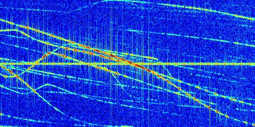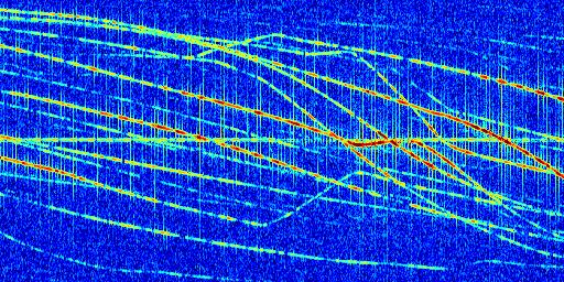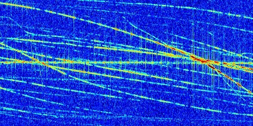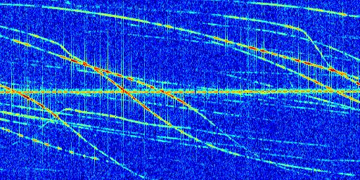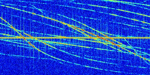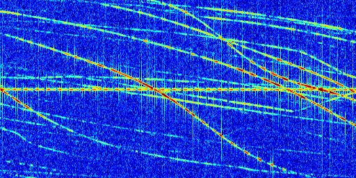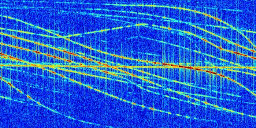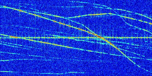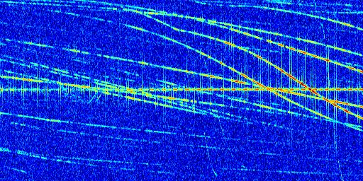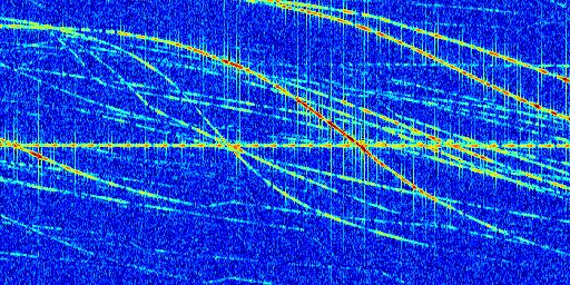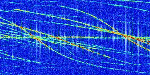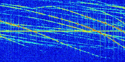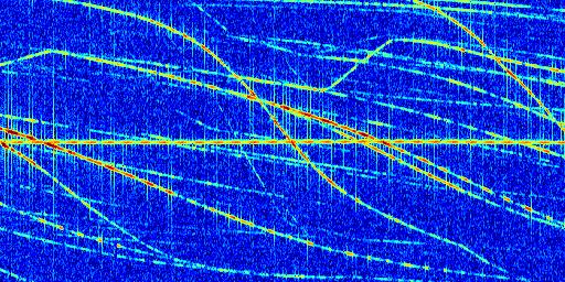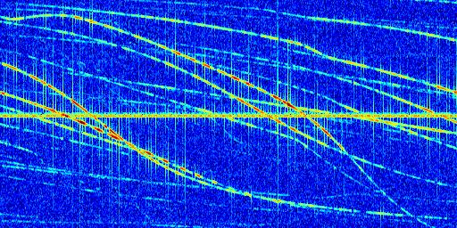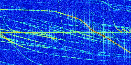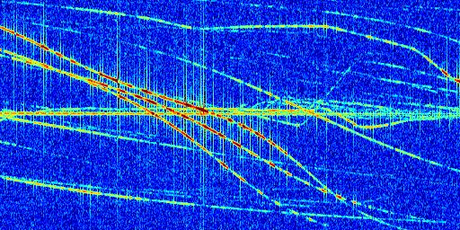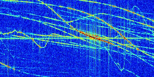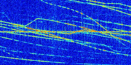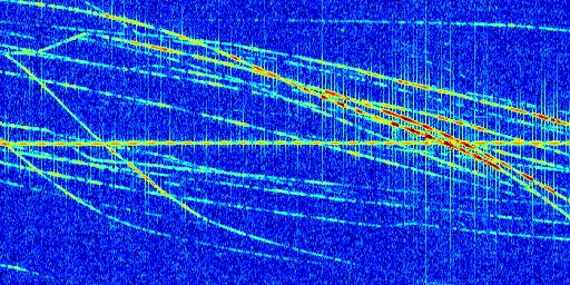 Sur la deuxième ligne, est représenté le spectrogramme radio du radar GRAVES. Un spectrogramme est une représentation d'un signal dans laquelle l'axe des abscisses représente le temps et l'axe des ordonnées les fréquences (hautes fréquences en haut, basses fréquences en bas). Au centre de ce spectrogramme on retrouve une ligne continue horizontale. C'est la trace de l'émetteur radio de GRAVES qui est ne varie pas en fréquence au cours du temps. Autour de cette dernière, on peut observer de nombreuses autres traces dont la fréquence varie. Ces traces résultent de la réflexion du signal radio de GRAVES sur des aéronefs en mouvement, générant un décalage Doppler. En observant finement ces dernières, il est possible de distinguer l'aviation civile et militaire.