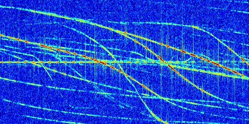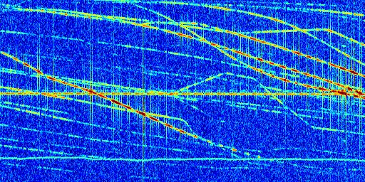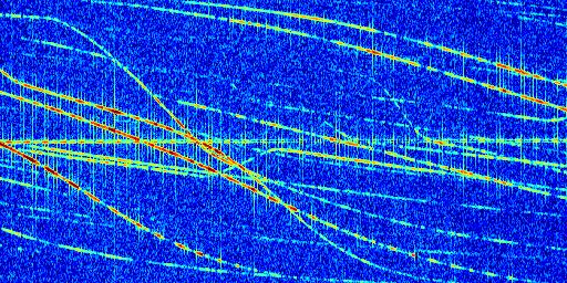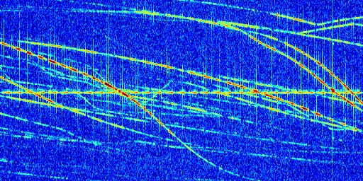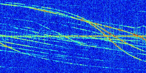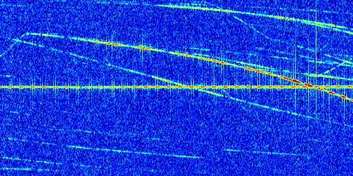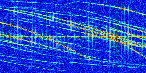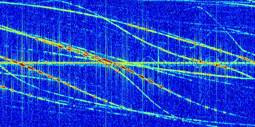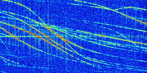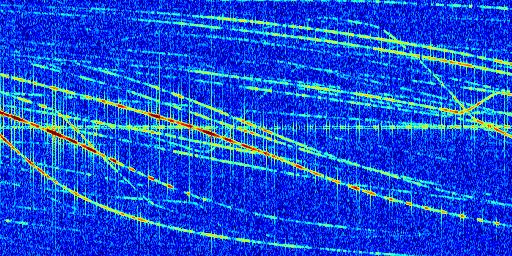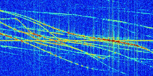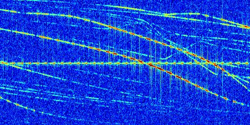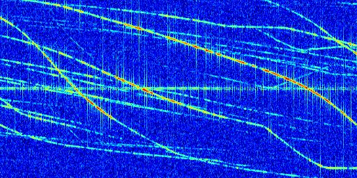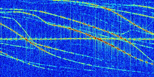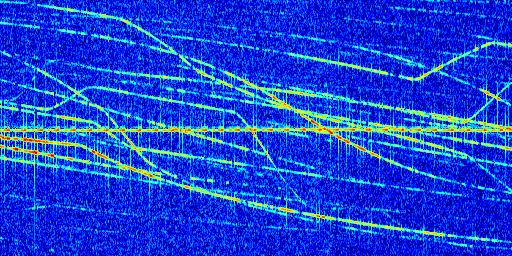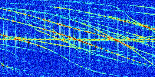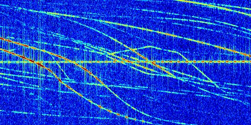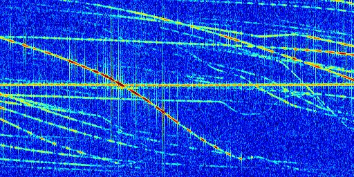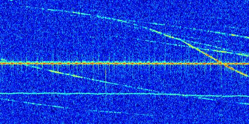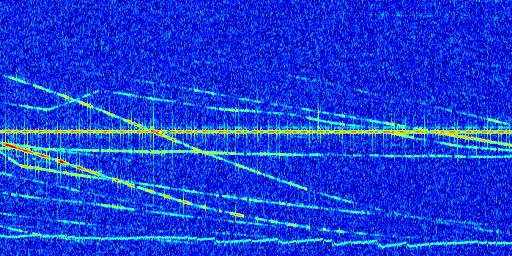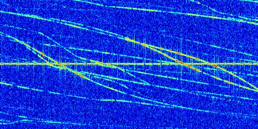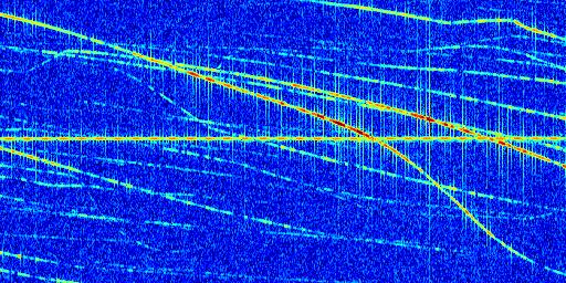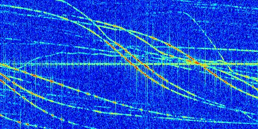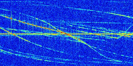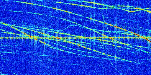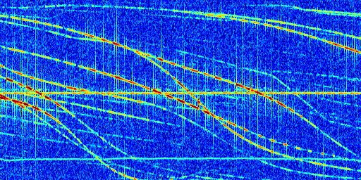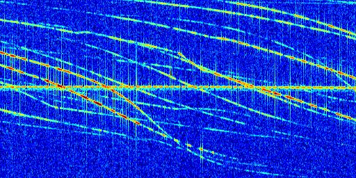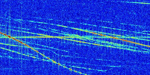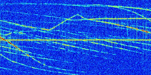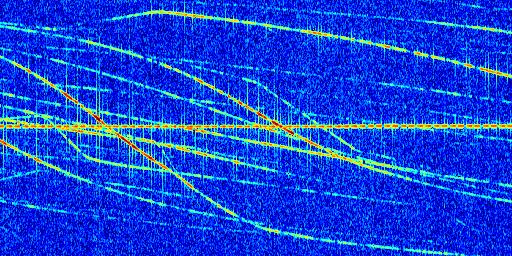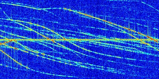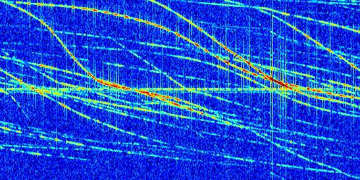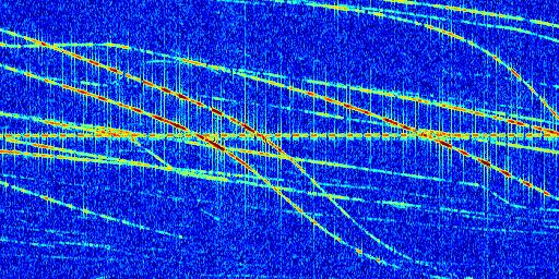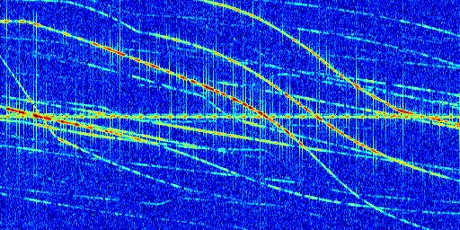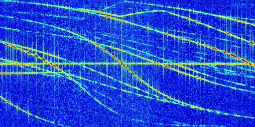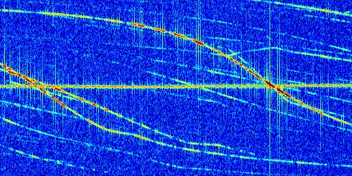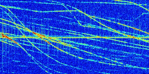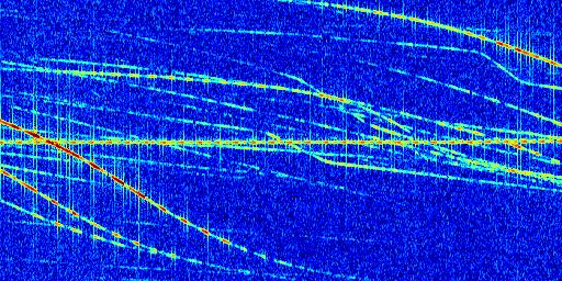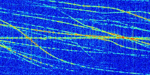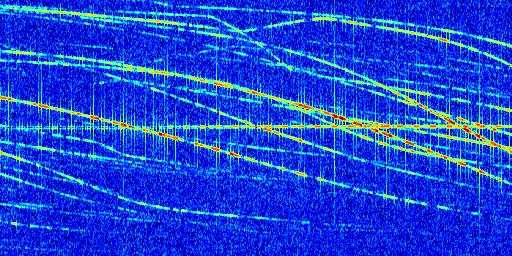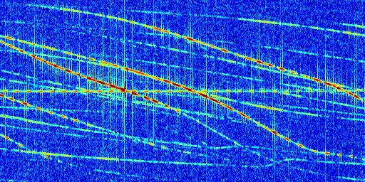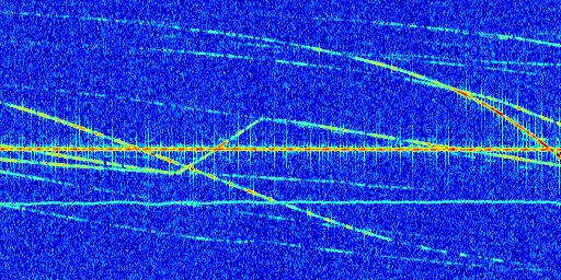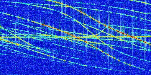 Sur la deuxième ligne, est représenté le spectrogramme radio du radar GRAVES. Un spectrogramme est une représentation d'un signal dans laquelle l'axe des abscisses représente le temps et l'axe des ordonnées les fréquences (hautes fréquences en haut, basses fréquences en bas). Au centre de ce spectrogramme on retrouve une ligne continue horizontale. C'est la trace de l'émetteur radio de GRAVES qui est ne varie pas en fréquence au cours du temps. Autour de cette dernière, on peut observer de nombreuses autres traces dont la fréquence varie. Ces traces résultent de la réflexion du signal radio de GRAVES sur des aéronefs en mouvement, générant un décalage Doppler. En observant finement ces dernières, il est possible de distinguer l'aviation civile et militaire.