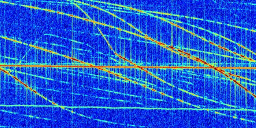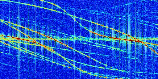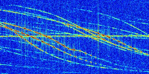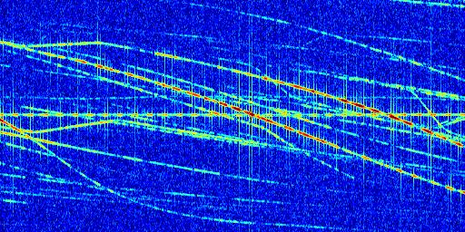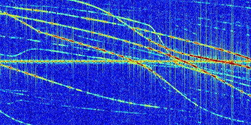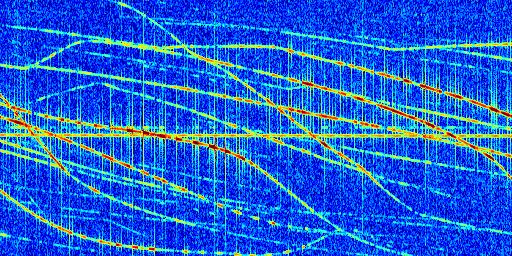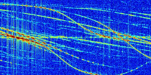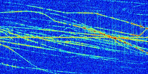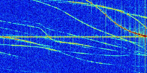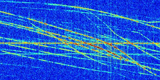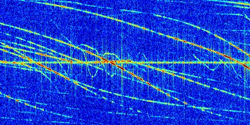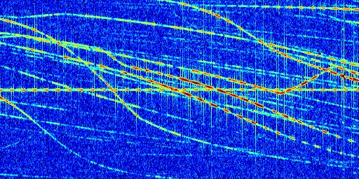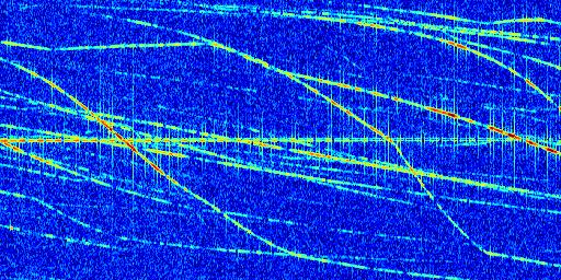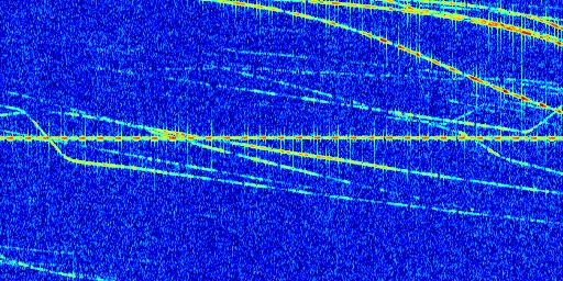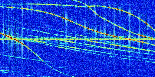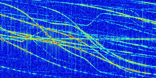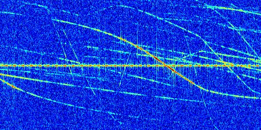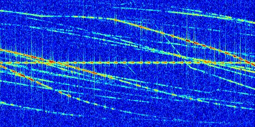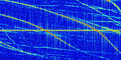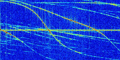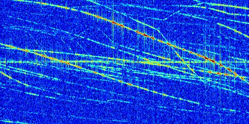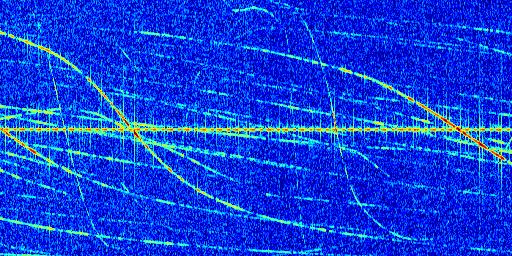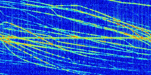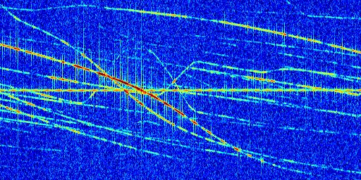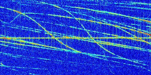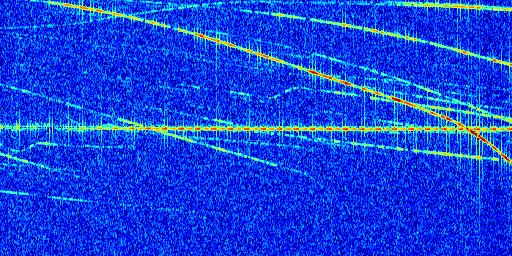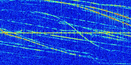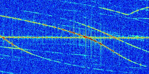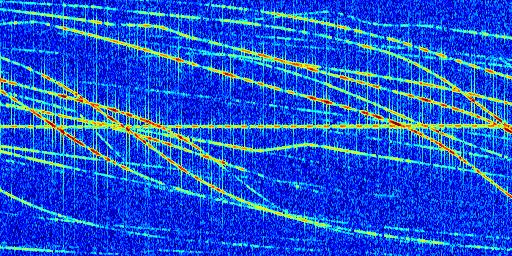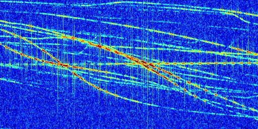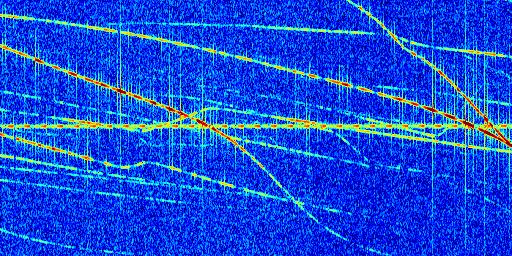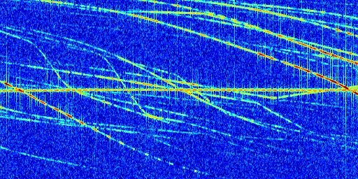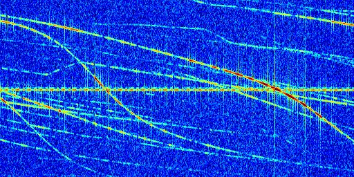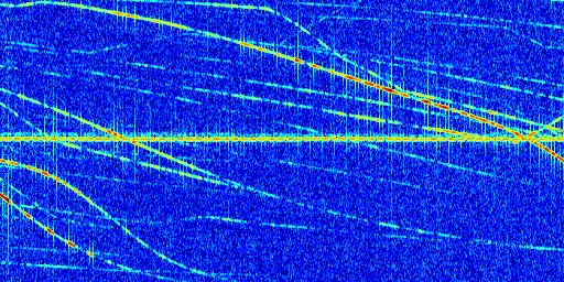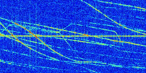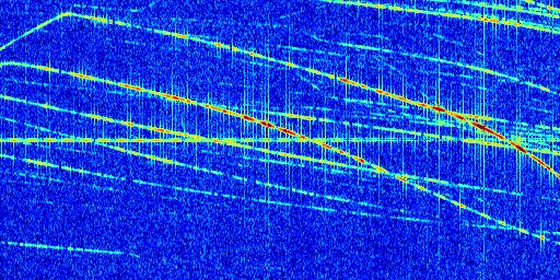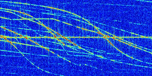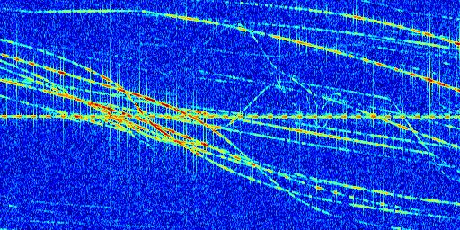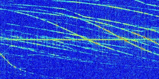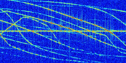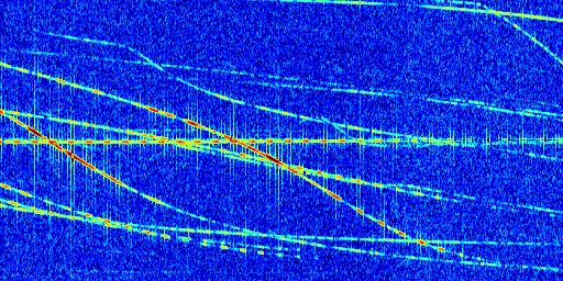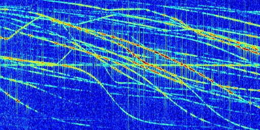 Sur la deuxième ligne, est représenté le spectrogramme radio du radar GRAVES. Un spectrogramme est une représentation d'un signal dans laquelle l'axe des abscisses représente le temps et l'axe des ordonnées les fréquences (hautes fréquences en haut, basses fréquences en bas). Au centre de ce spectrogramme on retrouve une ligne continue horizontale. C'est la trace de l'émetteur radio de GRAVES qui est ne varie pas en fréquence au cours du temps. Autour de cette dernière, on peut observer de nombreuses autres traces dont la fréquence varie. Ces traces résultent de la réflexion du signal radio de GRAVES sur des aéronefs en mouvement, générant un décalage Doppler. En observant finement ces dernières, il est possible de distinguer l'aviation civile et militaire.
