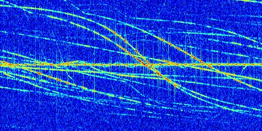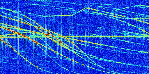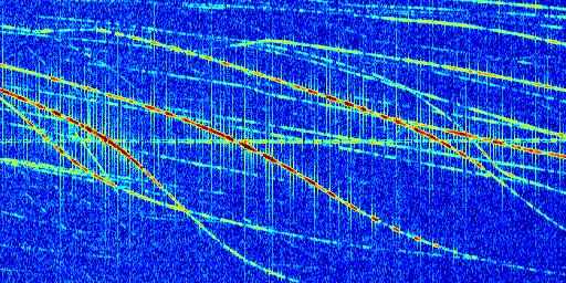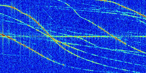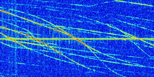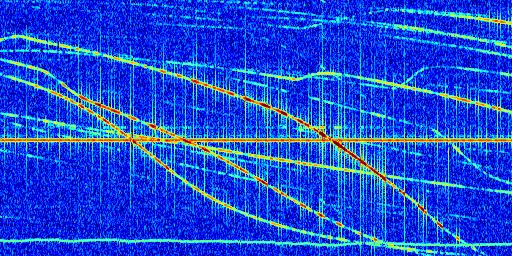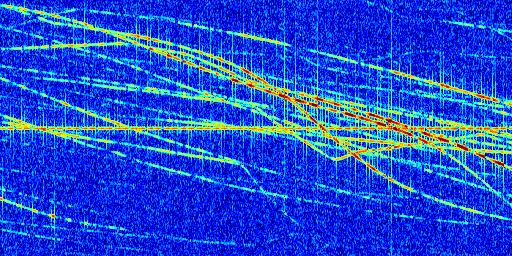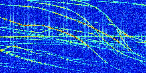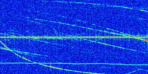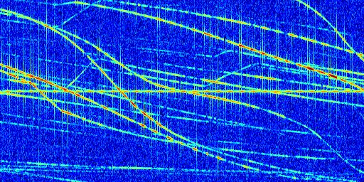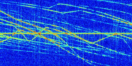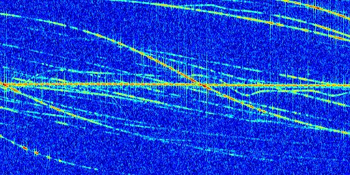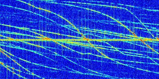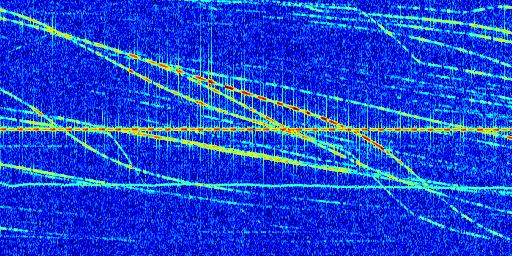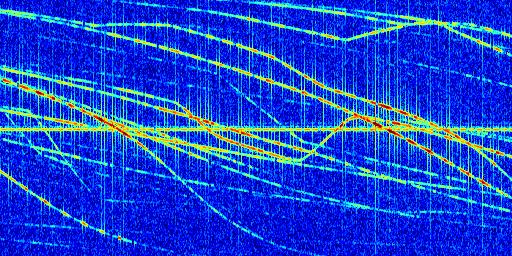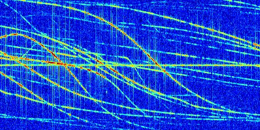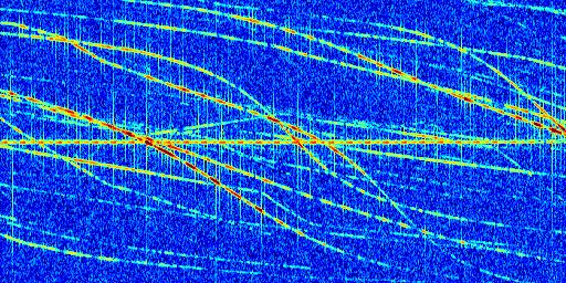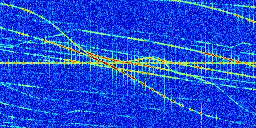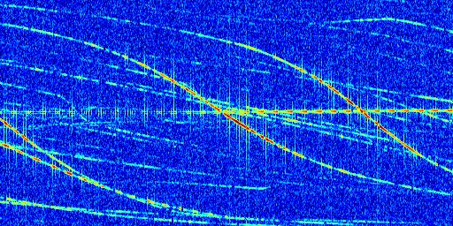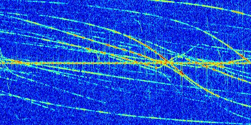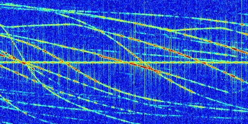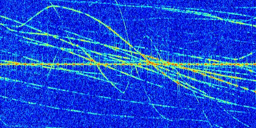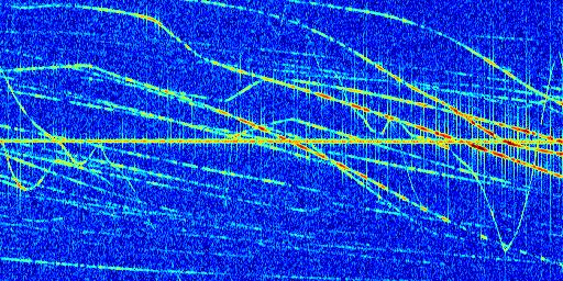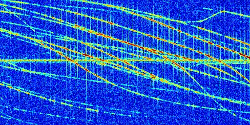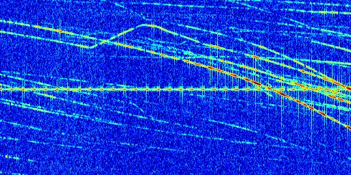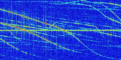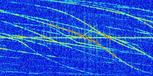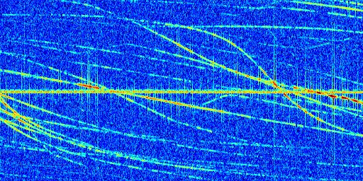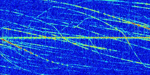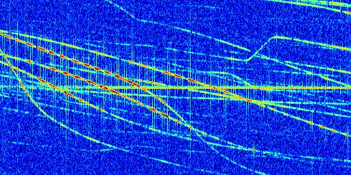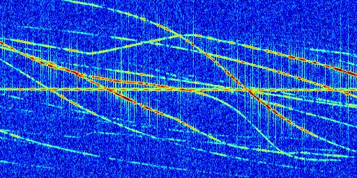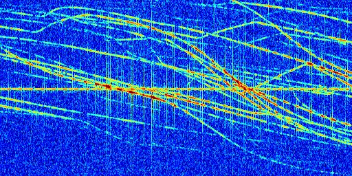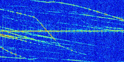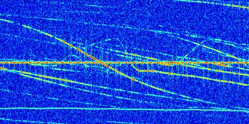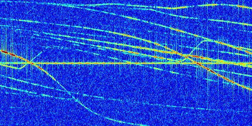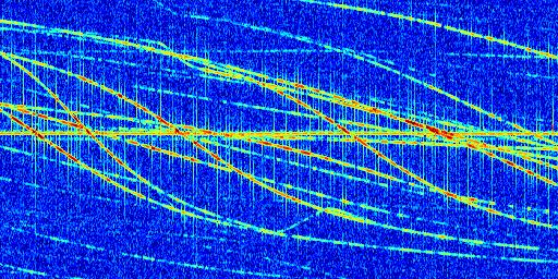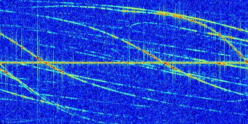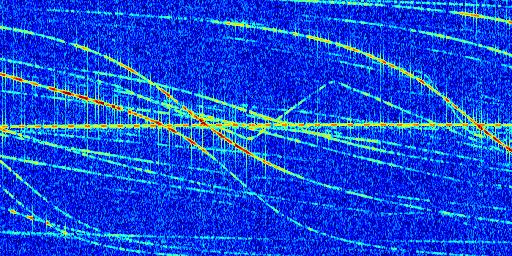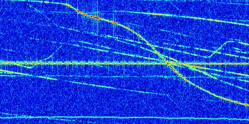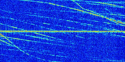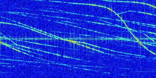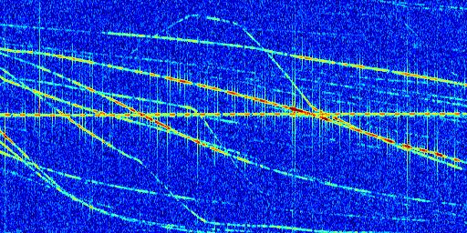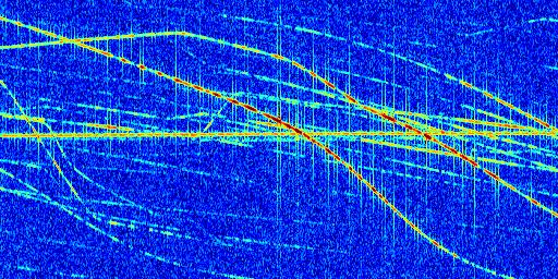Sur la deuxième ligne, est représenté le spectrogramme radio du radar GRAVES. Un spectrogramme est une représentation d'un signal dans laquelle l'axe des abscisses représente le temps et l'axe des ordonnées les fréquences (hautes fréquences en haut, basses fréquences en bas). Au centre de ce spectrogramme on retrouve une ligne continue horizontale. C'est la trace de l'émetteur radio de GRAVES qui est ne varie pas en fréquence au cours du temps. Autour de cette dernière, on peut observer de nombreuses autres traces dont la fréquence varie. Ces traces résultent de la réflexion du signal radio de GRAVES sur des aéronefs en mouvement, générant un décalage Doppler. En observant finement ces dernières, il est possible de distinguer l'aviation civile et militaire.