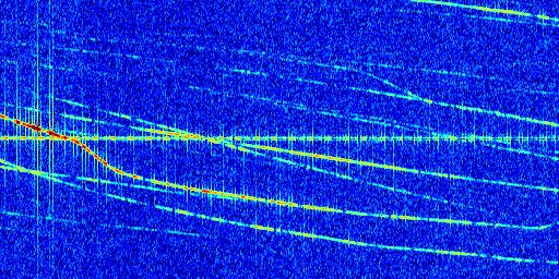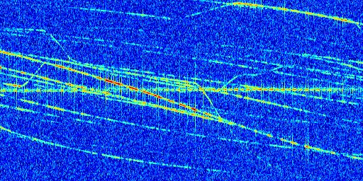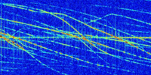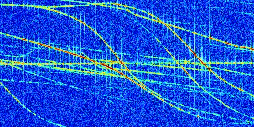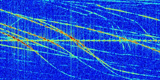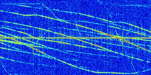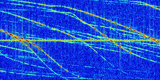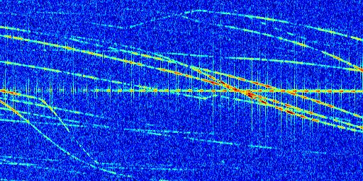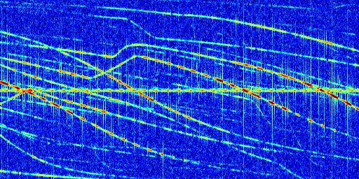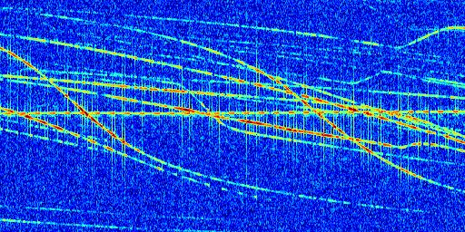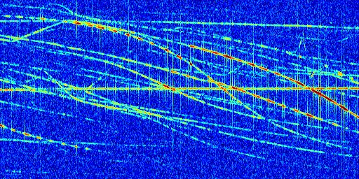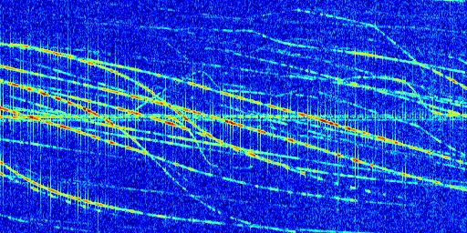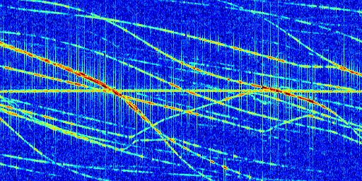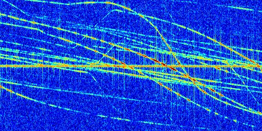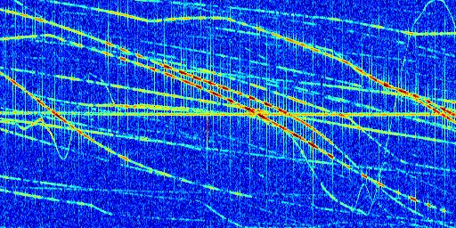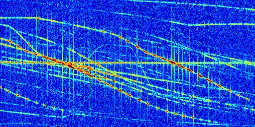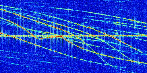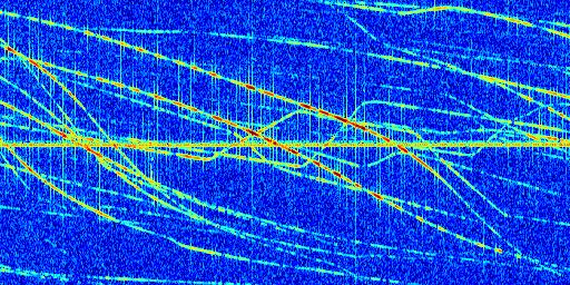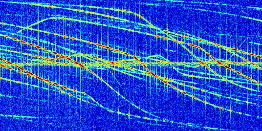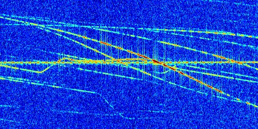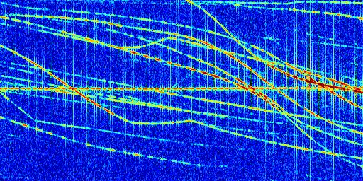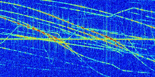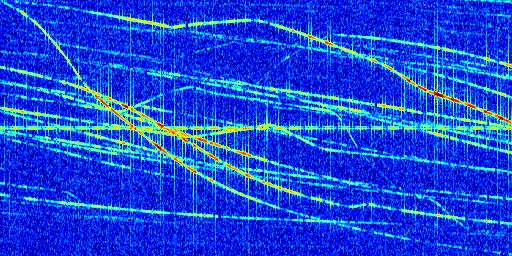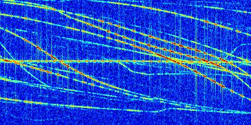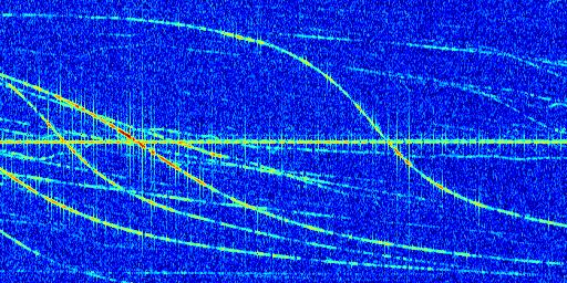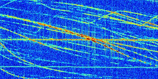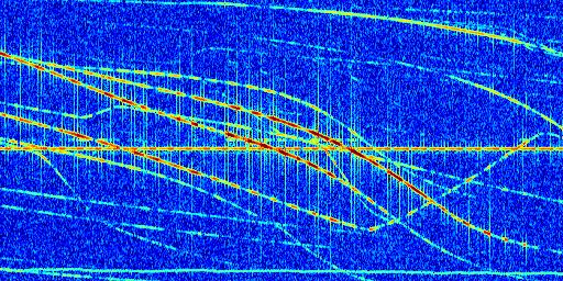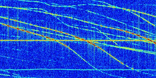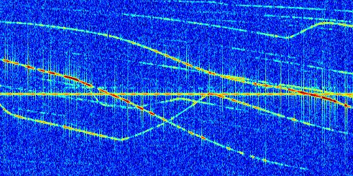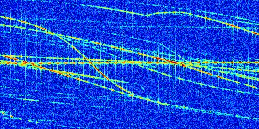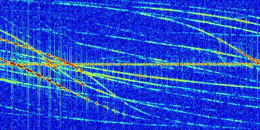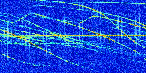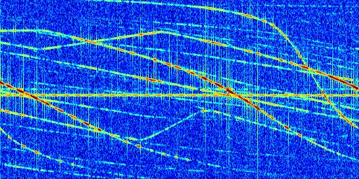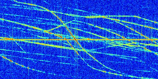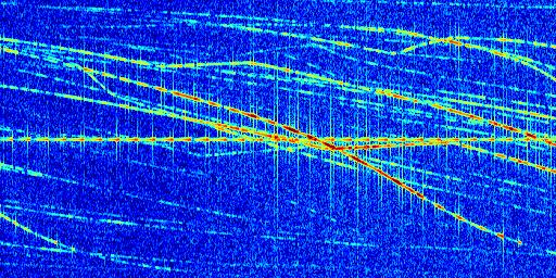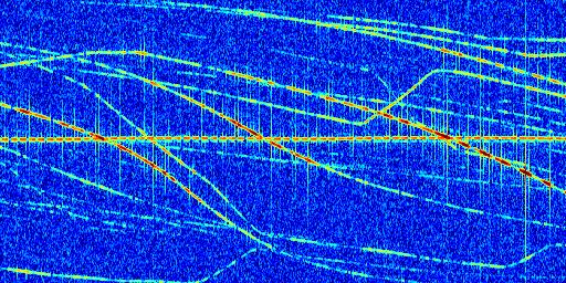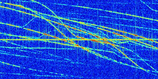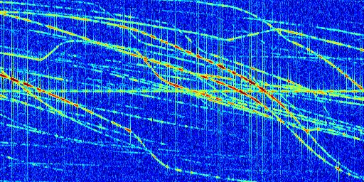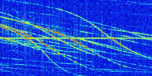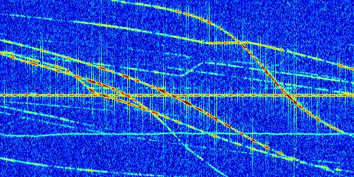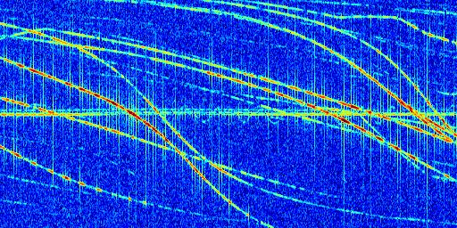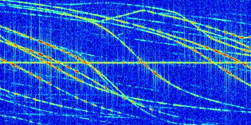 Sur la deuxième ligne, est représenté le spectrogramme radio du radar GRAVES. Un spectrogramme est une représentation d'un signal dans laquelle l'axe des abscisses représente le temps et l'axe des ordonnées les fréquences (hautes fréquences en haut, basses fréquences en bas). Au centre de ce spectrogramme on retrouve une ligne continue horizontale. C'est la trace de l'émetteur radio de GRAVES qui est ne varie pas en fréquence au cours du temps. Autour de cette dernière, on peut observer de nombreuses autres traces dont la fréquence varie. Ces traces résultent de la réflexion du signal radio de GRAVES sur des aéronefs en mouvement, générant un décalage Doppler. En observant finement ces dernières, il est possible de distinguer l'aviation civile et militaire.