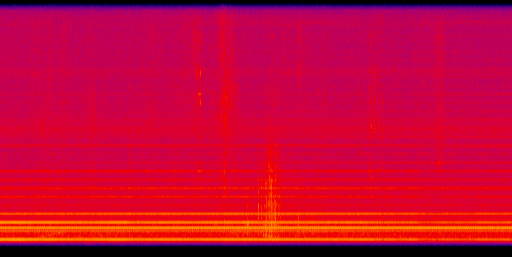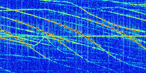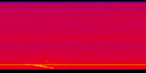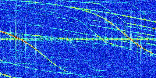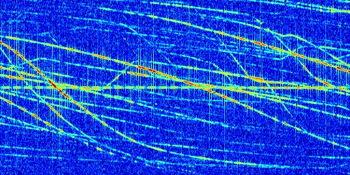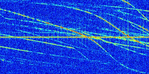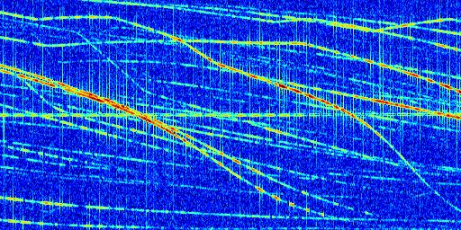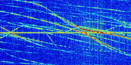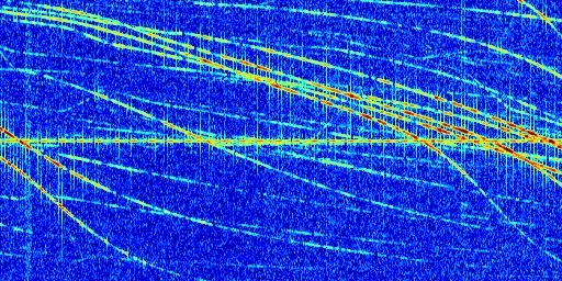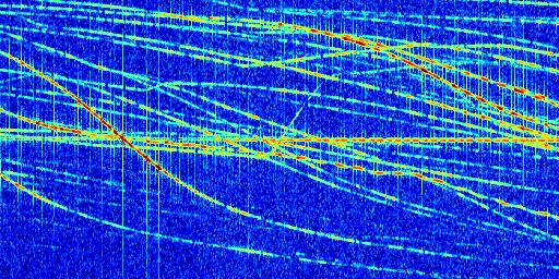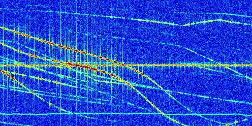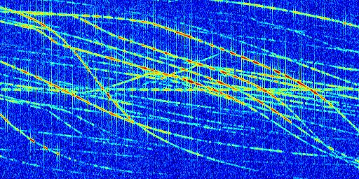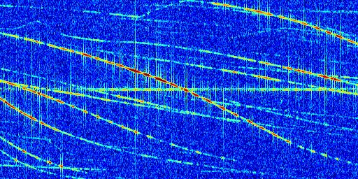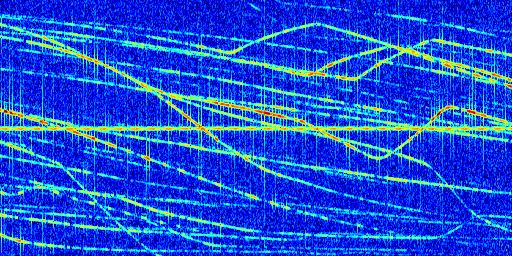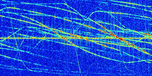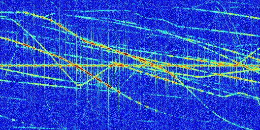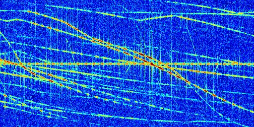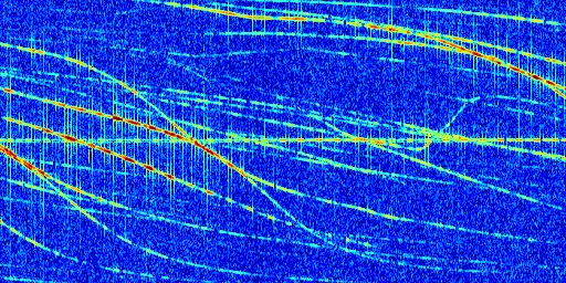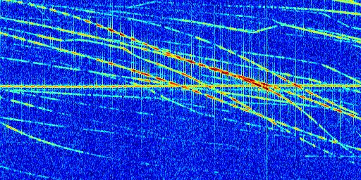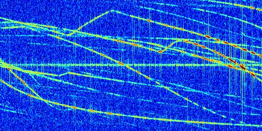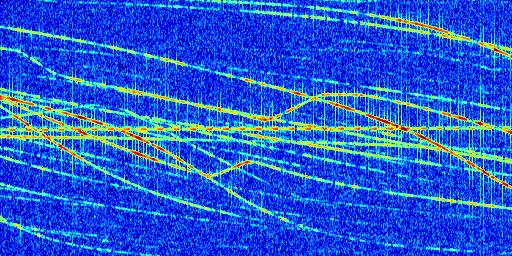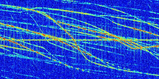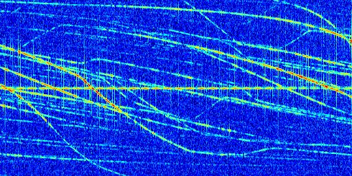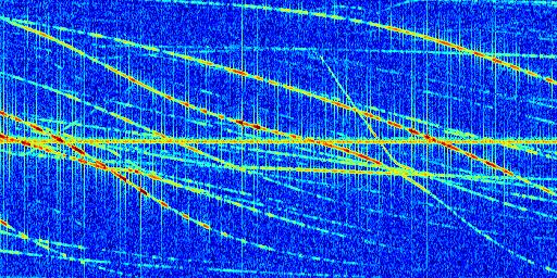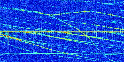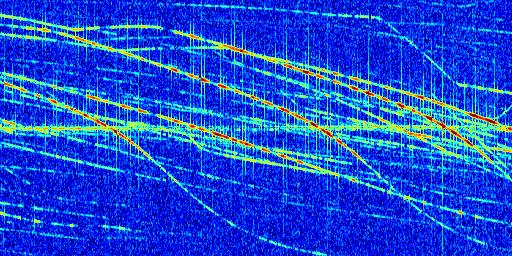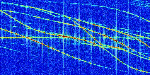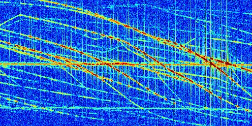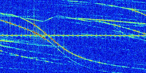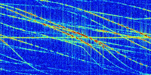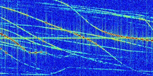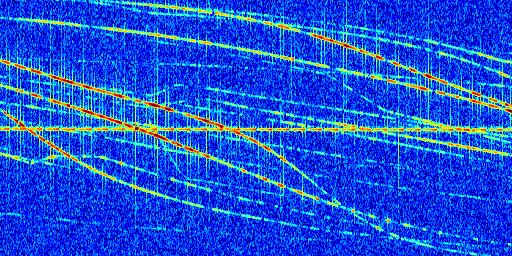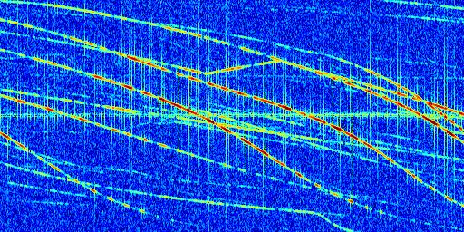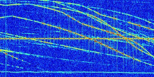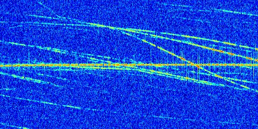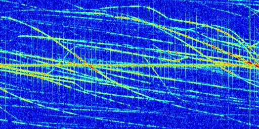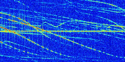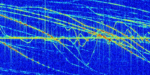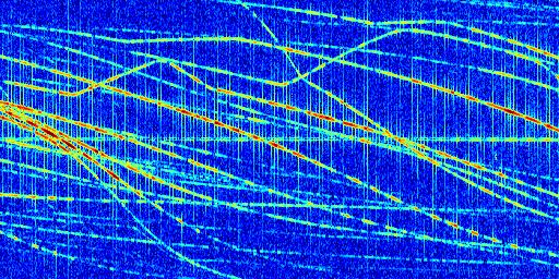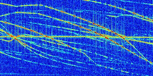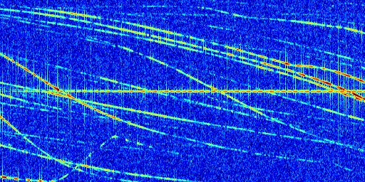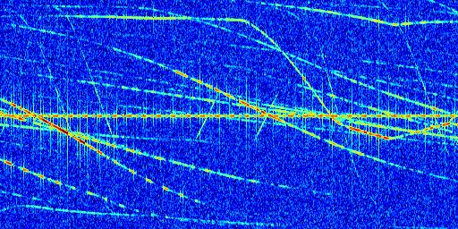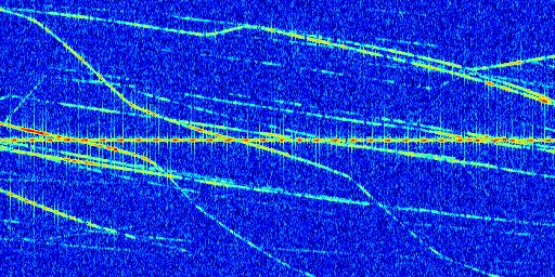 Sur la deuxième ligne, est représenté le spectrogramme radio du radar GRAVES. Un spectrogramme est une représentation d'un signal dans laquelle l'axe des abscisses représente le temps et l'axe des ordonnées les fréquences (hautes fréquences en haut, basses fréquences en bas). Au centre de ce spectrogramme on retrouve une ligne continue horizontale. C'est la trace de l'émetteur radio de GRAVES qui est ne varie pas en fréquence au cours du temps. Autour de cette dernière, on peut observer de nombreuses autres traces dont la fréquence varie. Ces traces résultent de la réflexion du signal radio de GRAVES sur des aéronefs en mouvement, générant un décalage Doppler. En observant finement ces dernières, il est possible de distinguer l'aviation civile et militaire.